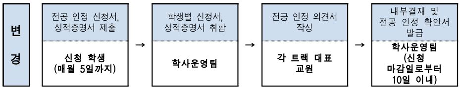 이번 개편을 통해, 14~19학번 학부생 대상 전공 인정서 확인 발급 절차도 간소화되었다. 기존에는 ▲매월 1일에서 10일 사이에 전공 인정 확인 신청서를 작성해 ▲트랙 대표 교원에게 제출하고 ▲전공 인정 의견서를 받은 후 ▲학사운영팀에 성적 증명서와 함께 제출하였다. 그러나 이번 변경안에 따르면, 학부생은 ▲전공 인정 신청서와 성적 증명서를 매월 5일까지 학사 운영팀으로 제출하고 ▲학사 운영팀에서 신청서 및 성적 증명서를 취합해 일괄적으로 각 트랙 대표 교원을 통해 전공 인정 의견서를 받은 후 ▲최종적으로 전공 인정 확인서를 발급한다.