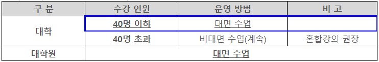 11월 8일부터 대학원은 전면 대면을 실시하며, 기초학부 강의는 수강인원에 따라 방식을 달리한다. 기초학부 강의 중 수강인원 40명 이하 강의는 대면 수업이 의무화된다. 사회적 거리두기 단계가 1단계로 전환되는 경우 추가 안내가 있을 예정이다.