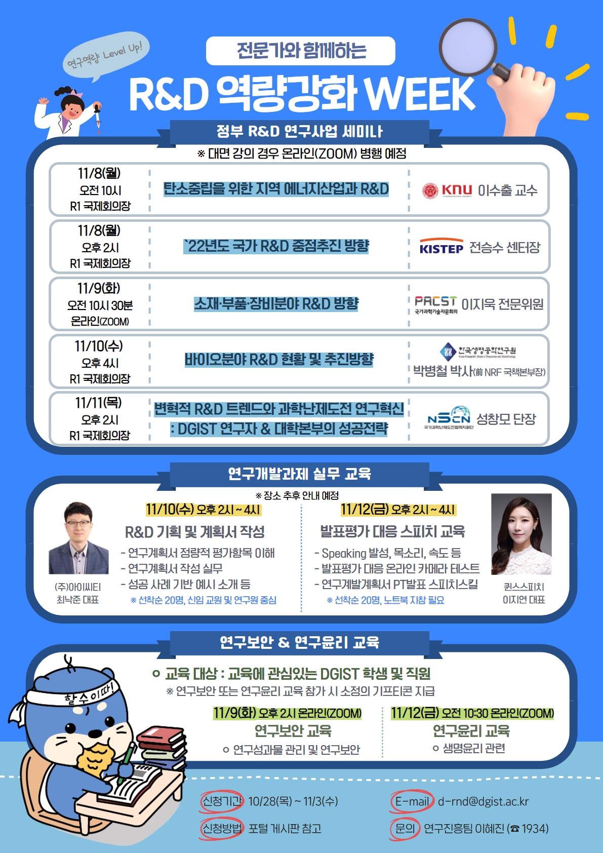 한편, 11월 둘째 주 동안 진행되는 전문가의 R&D 역량 강화 Week는 11월 12일 금요일 오전 10시 30분에는 온라인 플랫폼 Zoom을 통해 연구 윤리 교육이 이어진다.