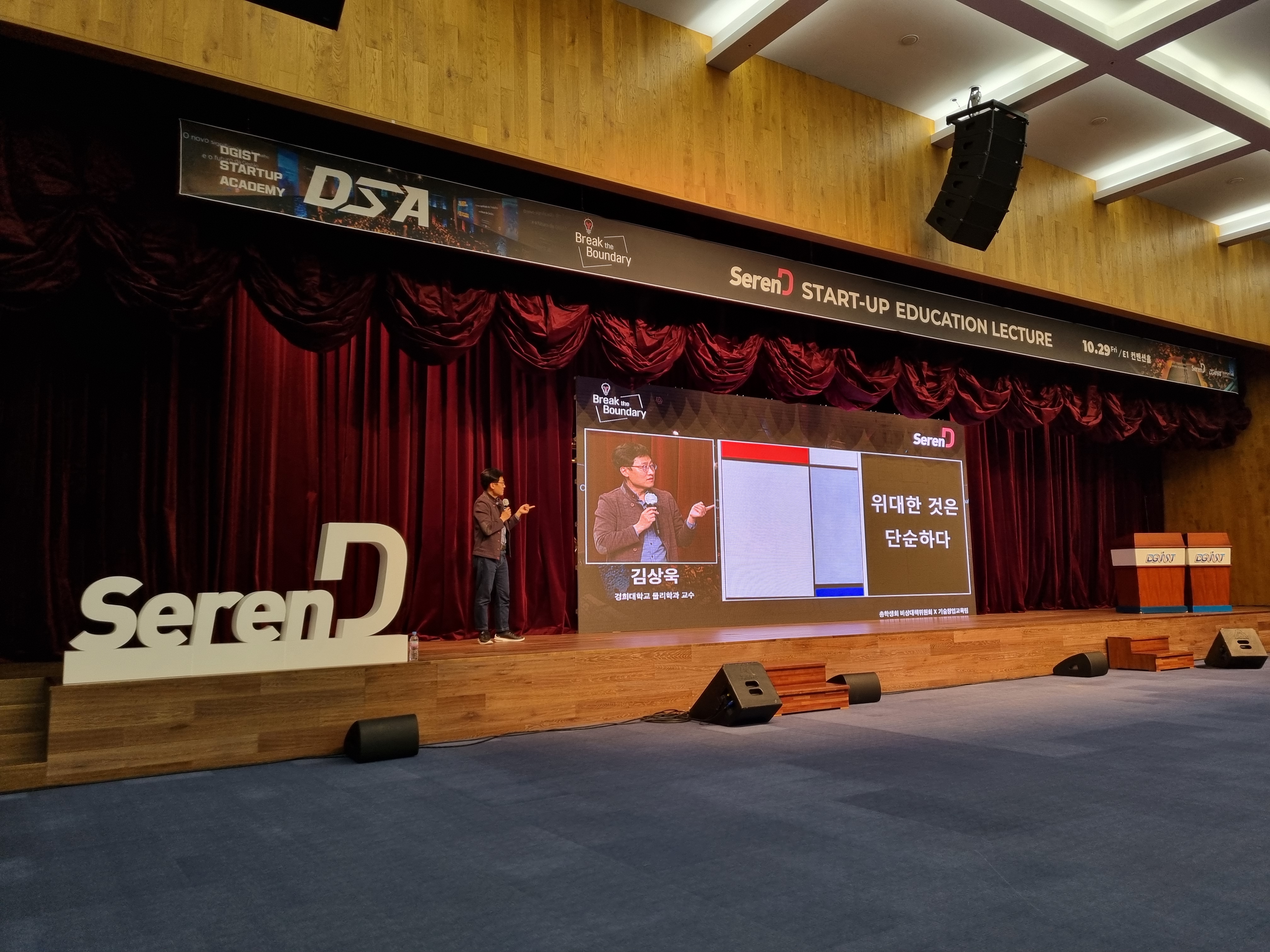 10월 29일, DGIST 기술창업교육팀과 총학생회 비상대책위원회에서 주최한 제2회 Seren D 행사가 대학본부(E1) 컨벤션홀에서 열렸다. 작년과 마찬가지로 학생들이 관심을 두는 ▲창업 ▲과학 ▲예술 ▲사회 분야의 연사를 초빙하여, ▲이금룡 회장(코글로닷컴, 前 옥션 창업자) ▲김상욱 교수(경희대학교 물리학과) ▲최홍섭 대표(마인즈랩) ▲미키김 전무(구글 사업제휴 아시아태평양 총괄)의 강연이 진행되었다.