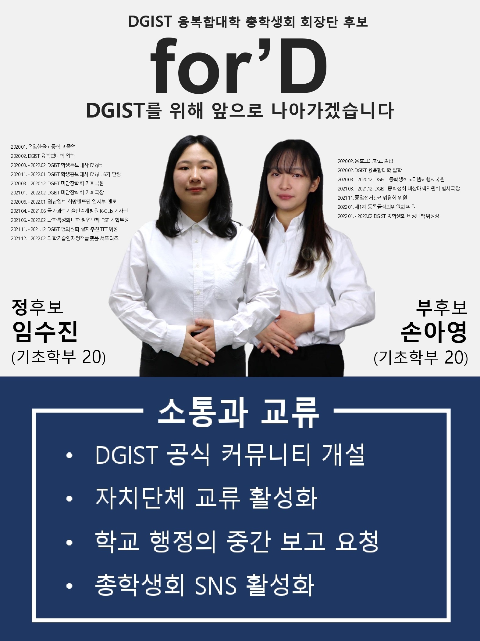 오는 3월 28일과 29일, 2022학년도 DGIST 총학생회장단 재선거가 시행된다. 단일후보로서 임수진 학생(20’)과 손아영 학생(20’)이 for’D의 정후보, 부후보로 출마하였다. for’D는 for DGIST와 forward를 뜻하며, DGIST를 위해 앞장서 일하겠다는 의미를 품고 있다.