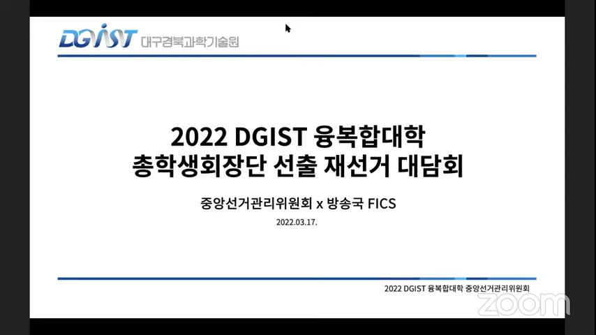 숨가쁘게 달려온 총학생회장단 재선거 일정이 끝을 향해 나아가고 있다. 선거를 앞두고, 마지막 공식 일정인 후보자 대담회가 지난 17일 오후 7시 비대면(zoom)으로 진행되었다. 선거에 출마한 선거운동본부가 하나뿐이므로 DGIST 중앙선거관리위원회는 토론회 대신 대담회를 기획했다. 대담회에서는 for’D 정후보 임수진 학생(’20), 부후보 손아영 학생(’20)의 공약 연설 및 질답으로 후보자들의 청사진을 엿보는 시간을 가졌다.