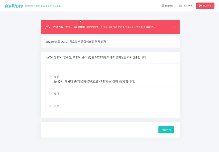 단일후보이기 때문에 신임(찬성), 불신임(반대)를 선택하게 된다. 특이하게도 기권이 선택지에 포함되어 있다. 온라인 투표는 무효표가 나올 수 없다 보니 별도의 선택지로 의도된 무효표를 반영한 듯하다. 당연하지만 선택은 하나만 할 수 있으며, 우측 하단에 제출하기를 누르면 투표가 완료된다.