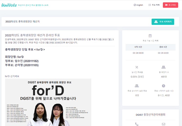 투표 사이트는 https://dgist.univote.co.kr이다. 이 주소는 현재 메일로 안내가 되었으며, 선거 당일에도 문자로 투표 사이트 링크가 발송될 것이 예상된다.