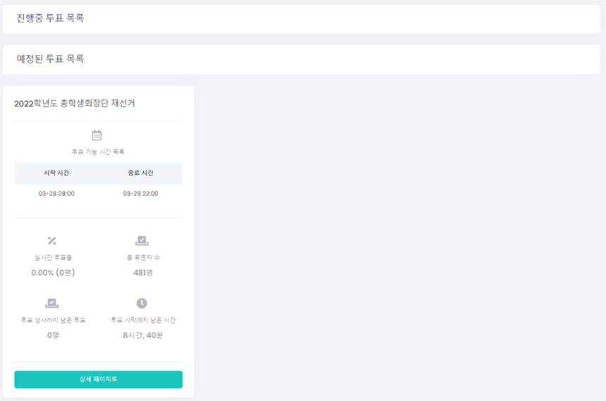 인증번호를 입력하거나 이메일로 온 인증 링크를 누르면 투표 목록을 확인할 수 있는 페이지에 접속된다. 현재는 총학생회장단 선거가 예정된 참여 가능 투표 목록에 들어가 있으나 28일 오전 8시가 되면 진행중 목록으로 옮겨질 예정이다.