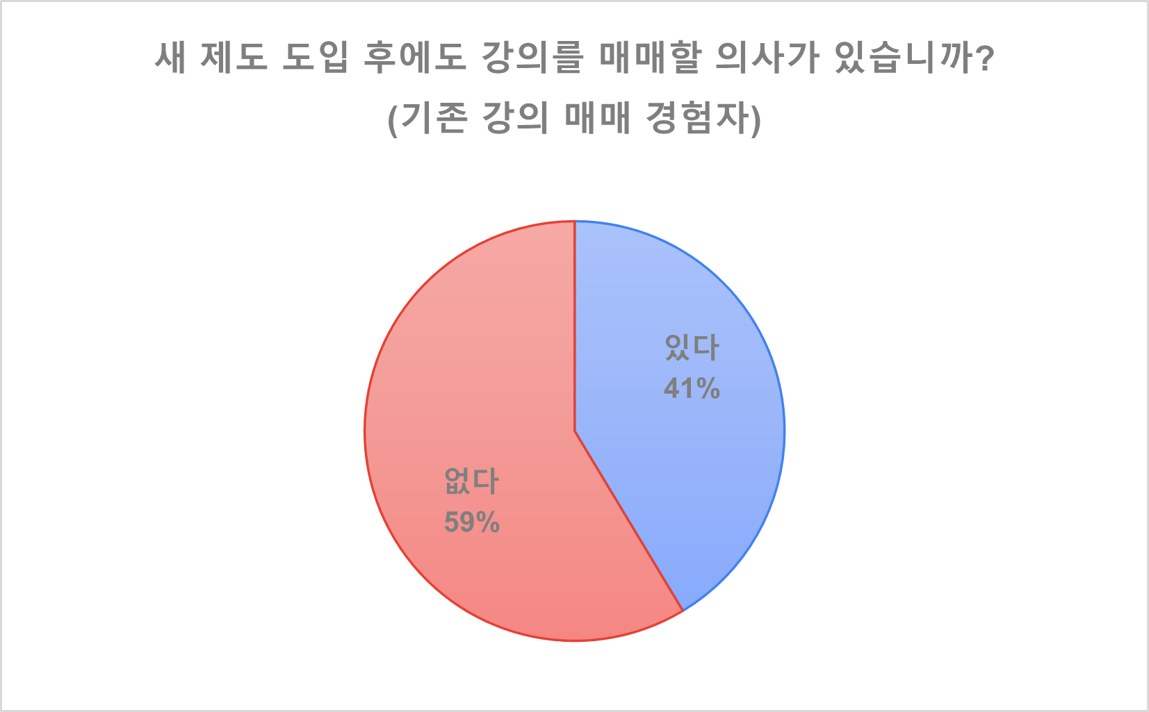 그러나 기존 강의 매매 경험자 중 41%(12명)에 달하는 사람들이 제도 도입 후에도 매매 의향이 있다고 밝혔다. 새로 도입된 제도의 실효성을 물은 질문에서 큰 의미 없다는 의견도 70%에 달했다. 5~20분 정도로는 여전히 강의를 수강 취소한 시점을 아는 구매자가 먼저 강의를 선점하기 유리하다는 의견이 여럿 있었다.