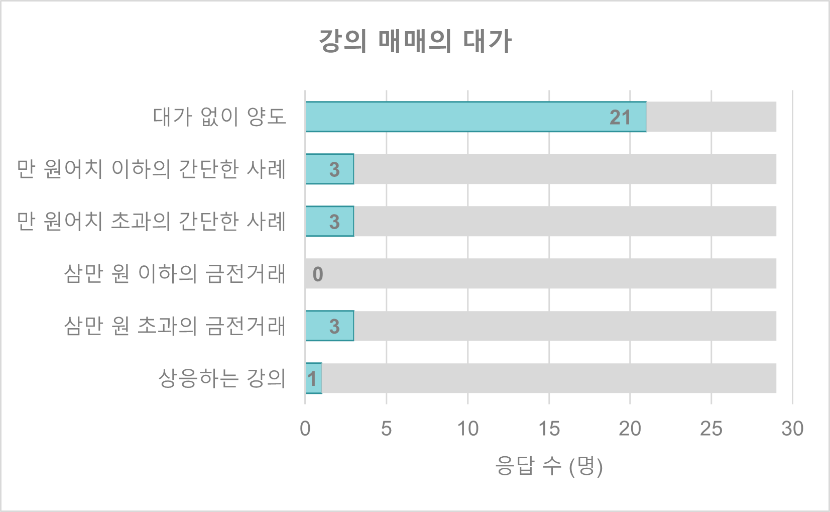 강의 매매는 대부분 대가 없는 단순 양도로 이뤄졌다. 대가가 있는 경우에도 금전 거래가 아니라 밥이나 음료 등으로 사례를 하는 것이 일반적이었다. 그러나 소수 고액의 금전 거래도 이루어졌다. 강의를 구매하려 했는데 10만원이 넘어가는 금액이라 포기했다는 응답도 있었으며, 이는 2학점을 재수강하는 비용에 달한다.
