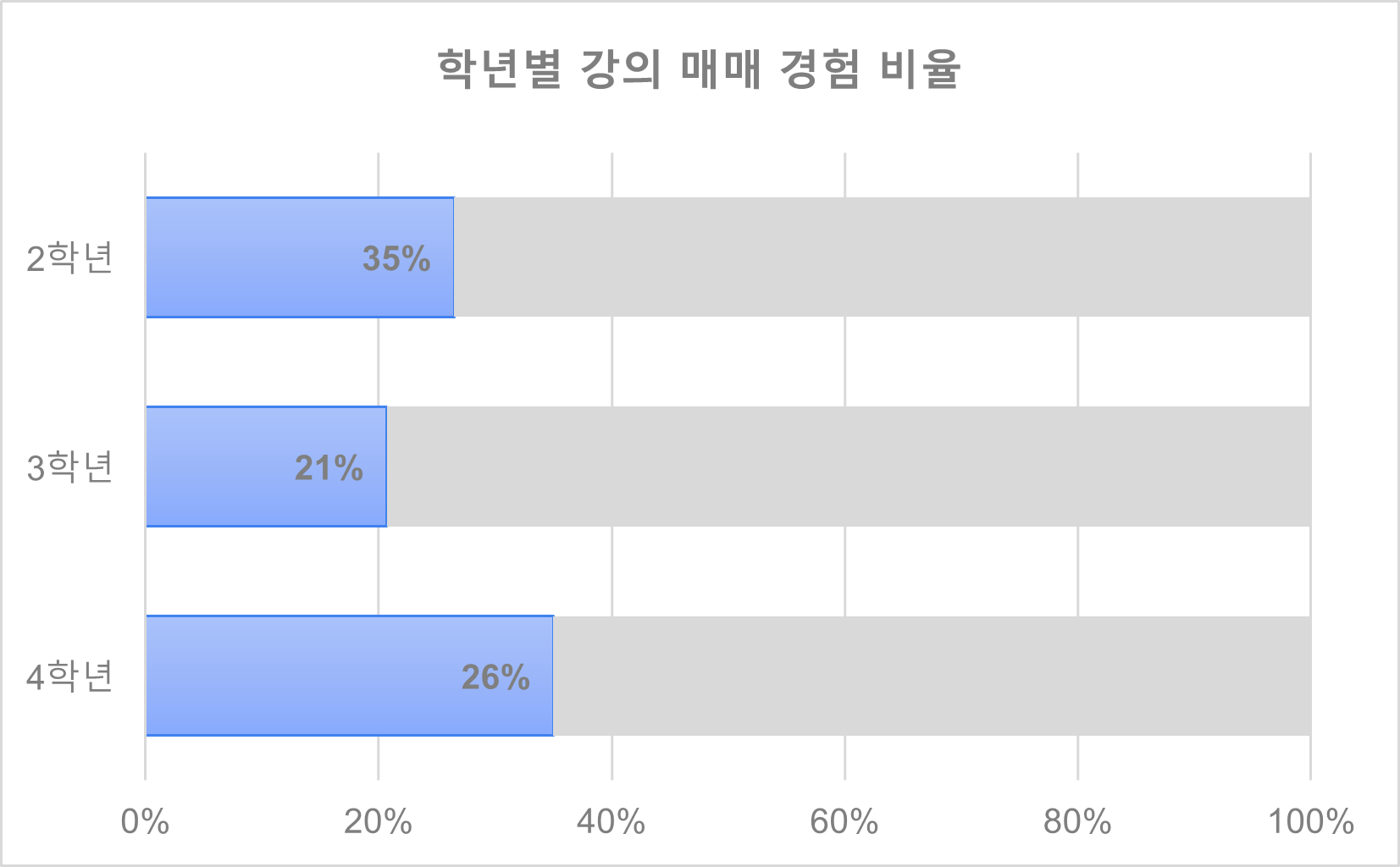 각 학년에서 매매 경험이 있는 학생은 ▲2학년 26% ▲3학년 21% ▲4학년 이상 35%였다. 4학년 이상이 수강 신청을 많이 겪은 만큼 경험이 많았다. 다만 2학년의 경험도 만만치 않게 많은 것은 학생 상당수가 저학년부터 강의 매매를 하는 것을 시사한다.