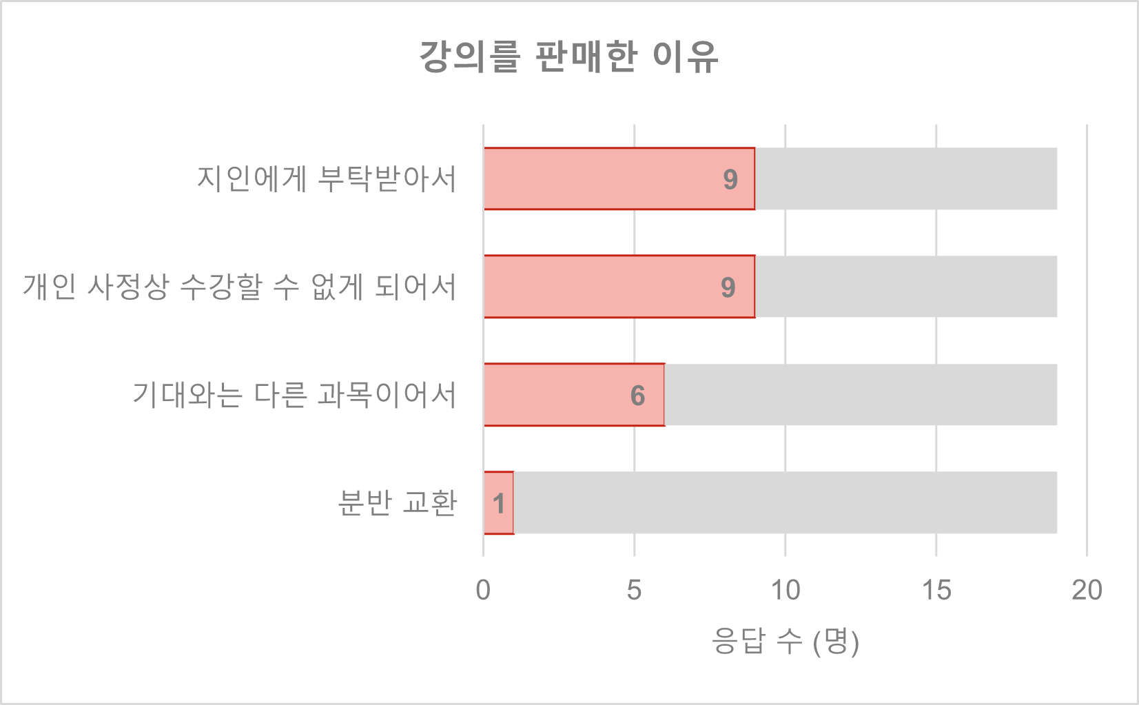 강의를 판매한 이유로는 지인에게 부탁받았다는 응답이 19명 중 9명으로 가장 많았다. 그 외 대부분은 수강신청을 했으나 변심으로, 혹은 개인사정상 수강 취소를 한 경우였다.
