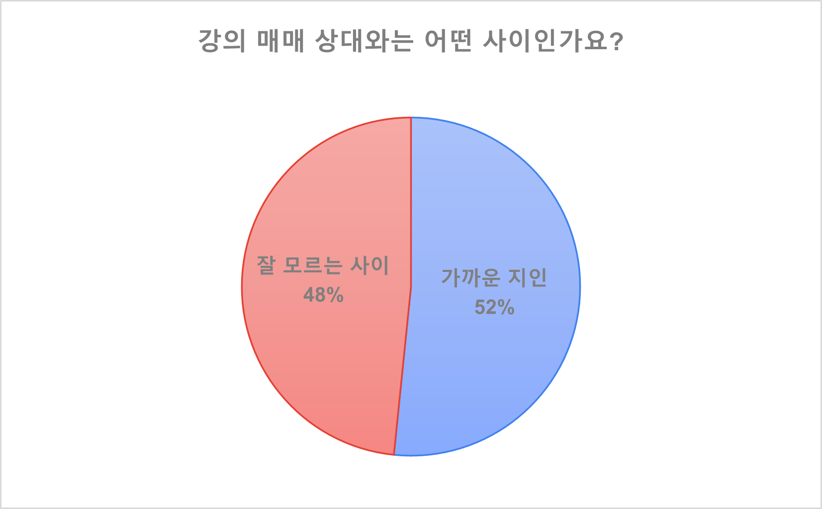 강의를 매매한 상대와는 가까운 지인이었다는 응답과 이름만 알거나 모르는 사이라는 응답 수가 거의 비슷했다. 가까운 지인 사이의 매매는 공개 커뮤니티에 올라오지 않으므로 공개 커뮤니티에서 보이는 수는 전체 강의매매 수의 절반에도 못 미친다고 추정할 수 있다.