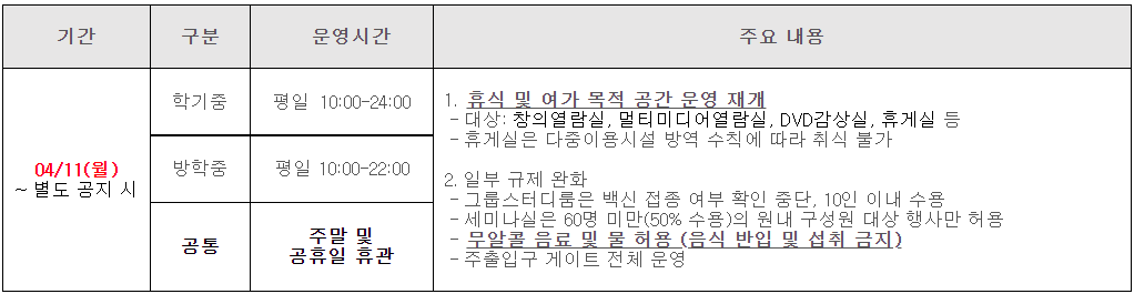 DGIST 재학생 및 교직원을 대상으로 4월 11일부터 아래와 같이 운영된다. 마스크 미착용, 그룹스터디룸의 미예약 이용, 음식 반입 등 이용수칙 위반 적발 시 즉시 퇴관 조치 및 출입정지 최대 3개월 등의 제재가 있을 수 있다.