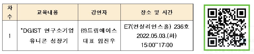 ‘DGIST 연구소기업 유니콘 성장기’라는 내용으로 5월 3일 E7 236호(컨실리언스홀)에서 ▲대학(원)생 ▲일반직원 ▲원내 연구자 대상으로 제 1차 DICE 강연이 진행된다.