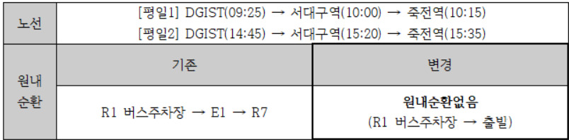 최근 서대구역 방면 평일 셔틀에서 정시 기차 탑승이 어렵다는 민원이 제기되어 서대구역행 평일 셔틀버스의 원내 순환을 실시하지 않는다. 다른 노선은 기존처럼 원내 순환한다.