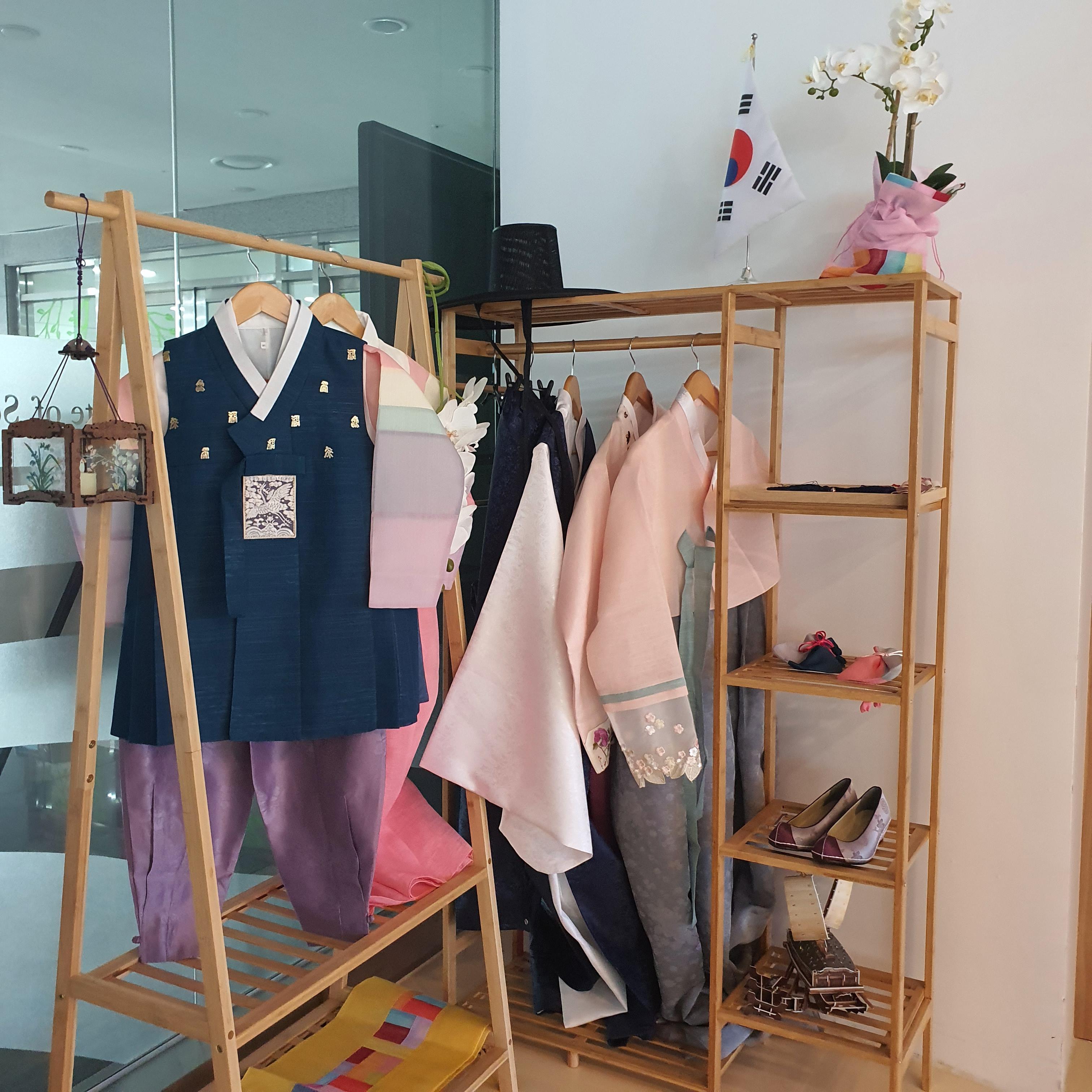 입구로 들어가서 왼쪽으로 돌면 한국 문화 체험 공간이 있다. 이 공간에는 누구든지 입어볼 수 있는 한복이 마련되어 있다. 그 반대편에는 대조적으로 다양한 언어로 가득 차 있는 Language Board가 있다.