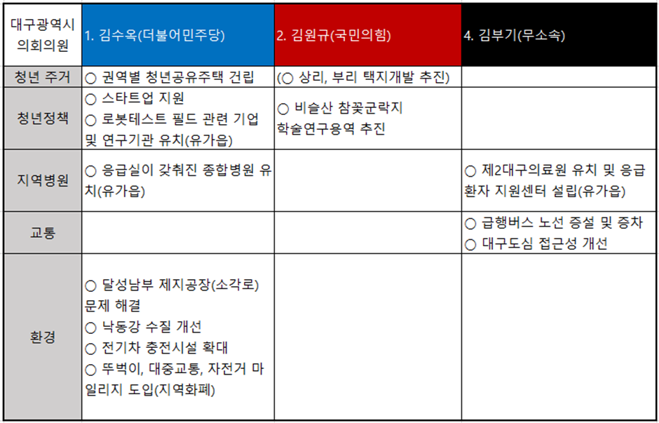 DGIST 구성원의 투표를 돕기 위해 현풍·유가읍과 관련된 공약을 중앙선거관리위원회에 게시되어 있는 각 후보자의 공보물로 분석하였다. ▲청년 주거 ▲청년 정책 ▲지역병원 ▲교통 ▲환경에 초점을 맞췄다.