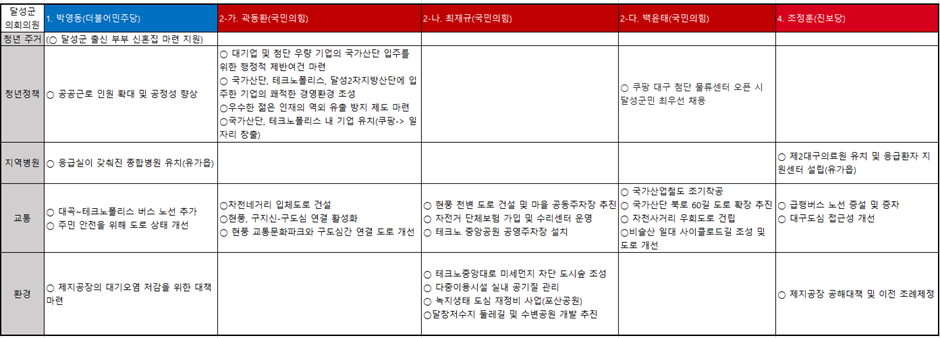 달성군의회의원 후보자는 ▲1번 더불어민주당 박영동 ▲2-가번 국민의힘 곽동환 ▲2-나번 국민의힘 최재규 ▲2-다번 국민의힘 백윤태 ▲4번 진보당 조정훈 총 5명이다. 현풍·유가읍과 관련된 공약을 중앙선거관리위원회에 게시되어 있는 각 후보자의 공보물로 분석하였으며, ▲청년 주거 ▲청년 정책 ▲지역병원 ▲교통 ▲환경에 초점을 맞췄다.