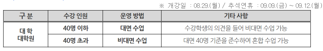 개강 후 추석 전까지 (8/29 - 9/8) 수강인원에 따라 대면 혹은 비대면 수업을 혼용한다. 추석 이후 4일동안 (9/13 - 9/16) 전면 비대면 수업을 시행한 후 대면 수업을 진행할 계획이다.
