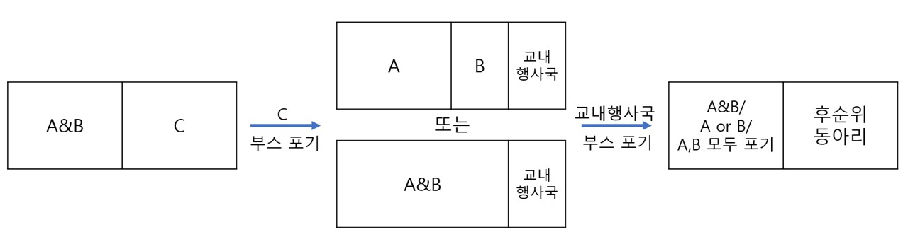 그 사이 9개 동아리 중 하나가 부스 운영을 포기하면서 1개의 빈 부스가 발생하였다. 교내행사국은 이 자리를 후순위 동아리에게 돌려주는 방안을 채택하지 않았고, A 또는 B에게 우선적으로 배정권을 주는 방안을 채택하였다. 대신 0.5개는 교내행사국이 붕어빵 부스를 열고, 나머지 0.5개를 A와 B에게 배정하겠다고 통보했다. A와 B는 ▲연합하여 1.5개의 부스를 사용하거나 ▲A가 1개 부스, B가 0.5개 부스를 사용하되 A의 매장용 테이블 배정 순위가 뒤로 밀리는 선택지를 안내받았다.