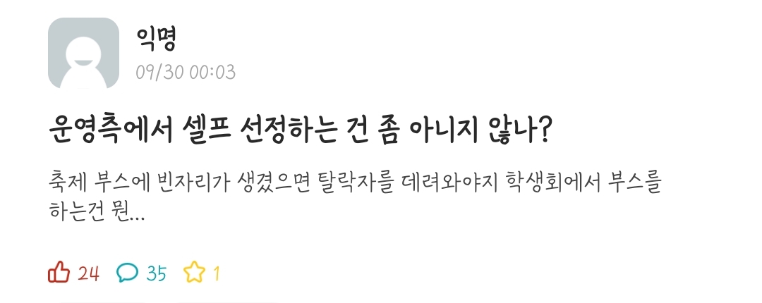 한편, 교내행사국은 탈락 통보를 누락하는 실수를 범하기도 했다. 이에 합격 동아리 단체채팅방 개설 이튿날인 30일 오후, 누락된 동아리에 불합격 통보와 사과를 전했다. 교내행사국은 앞선 부스 모집 중 지원 설비 및 주류 판매 가능 여부의 안내에서 미숙한 모습을 보이기도 했다.