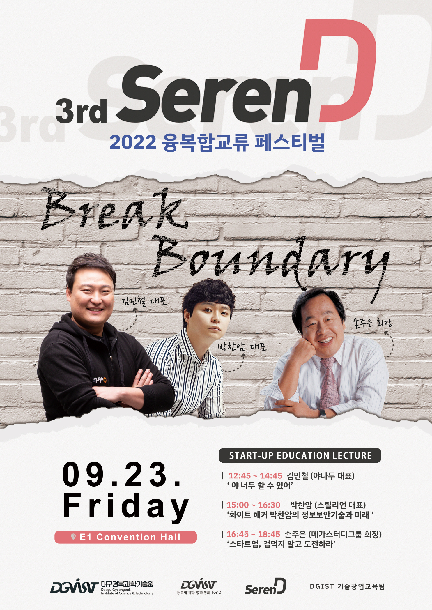 9월 23일, DGIST 기술창업교육팀과 총학생회 for’D에서 주최한 제3회 Seren D 행사가 대학본부(E1) 컨벤션홀에서 열렸다. 올해의 주제는 ‘Break Boundary’로 ▲김민철 대표(야나두) ▲박찬암 대표(스틸리언) ▲손주은 회장(메가스터디그룹) 세 연사의 강연이 진행되었다.