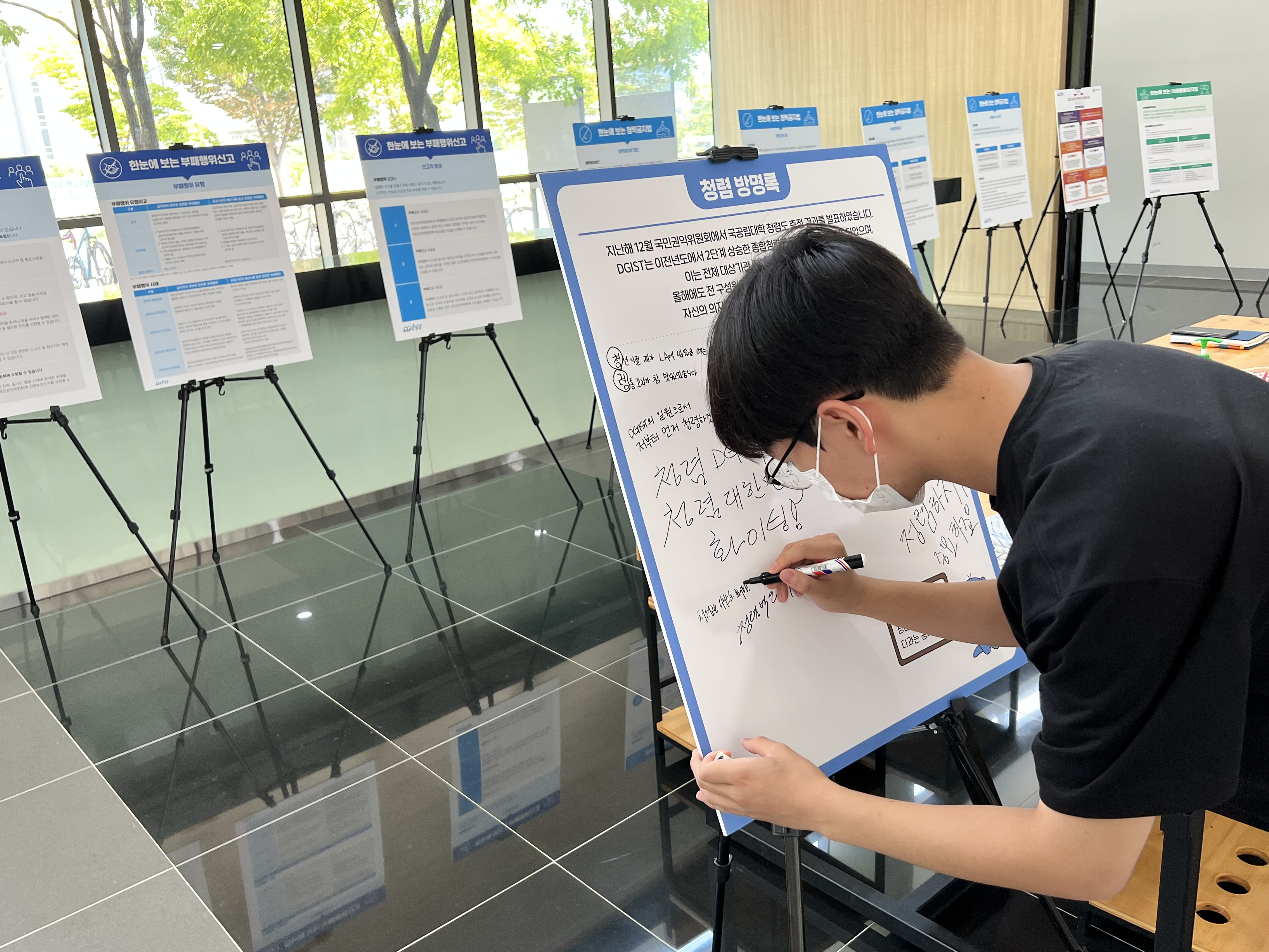 지난 9월 26일부터 10월 4일까지 DGIST 구성원들의 청렴 수준 향상과 공직문화 선도를 위해 ‘DGIST 집중청렴주간’ 행사 ▲청렴 메시지 전파 ▲청렴 포스터 전시회 ▲청렴 헌장 서약식 ▲청렴 영화 상영 ▲청렴 화분 가꾸기 ▲청렴 표어 인증샷 이벤트 ▲청렴 교육세미나가 진행되었다.