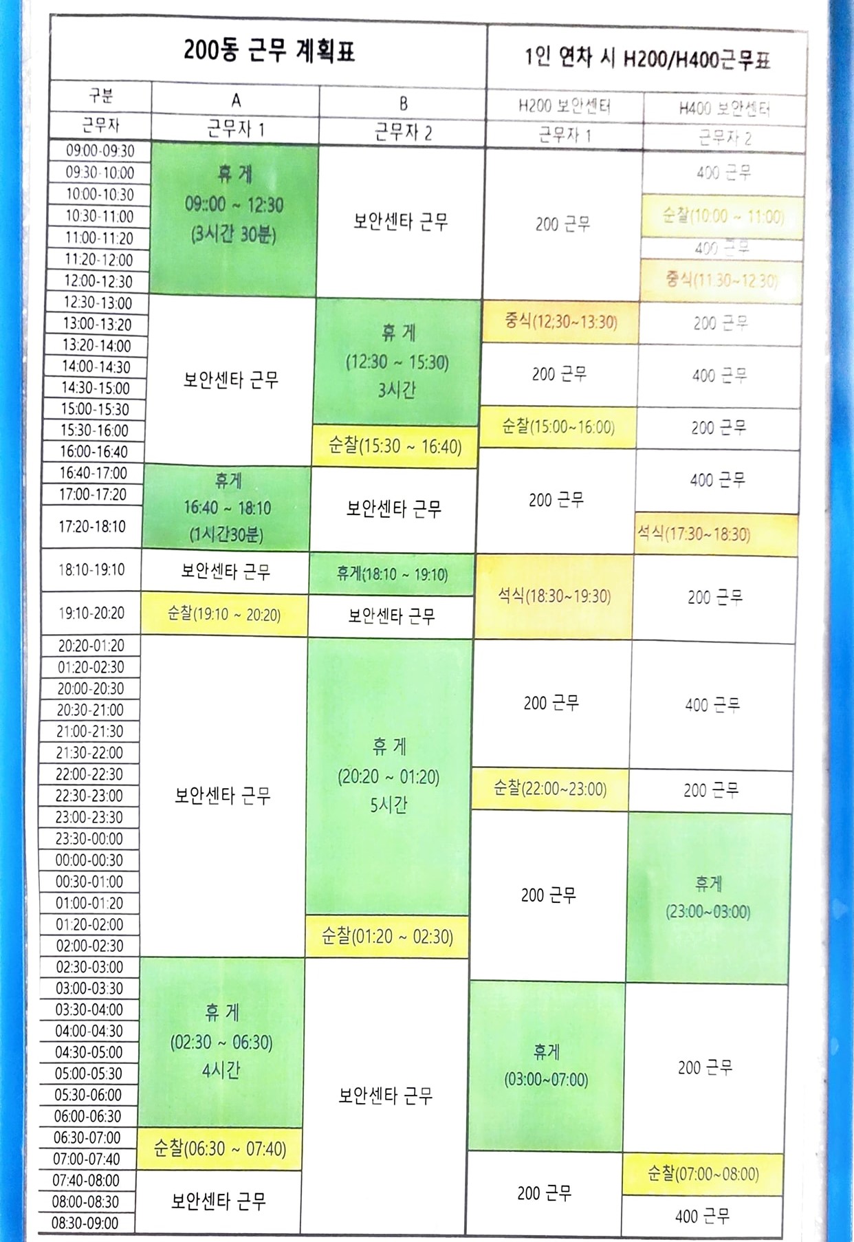 또 순찰 업무도 있는데 1일 4회마다 1시간씩 돕니다. 순찰 시간은 정해져 있고, 각 동 각 층을 전부 돌아다니면서 확인하고, 그 외 시간에는 CCTV 모니터링, 카드키 대여 등을 하고 있습니다. (근무 형태가 독특하다고 알고 있습니다.) 24시간 일하고 다음 날 오프가 기본입니다. A조 B조로 돌아가는 거죠. 하루에 세 명이 근무하는데 한 명은 400동에서 근무하고, 200동에서 근무하면 15시간 일하고 9시간 쉽니다. 이 휴게시간은 저희가 쉬고 싶어서 들어간 게 아니라 회사에서 임금 삭감 명목으로 무급 휴게시간을 정한 거죠. 일방적으로 바뀐 거예요.