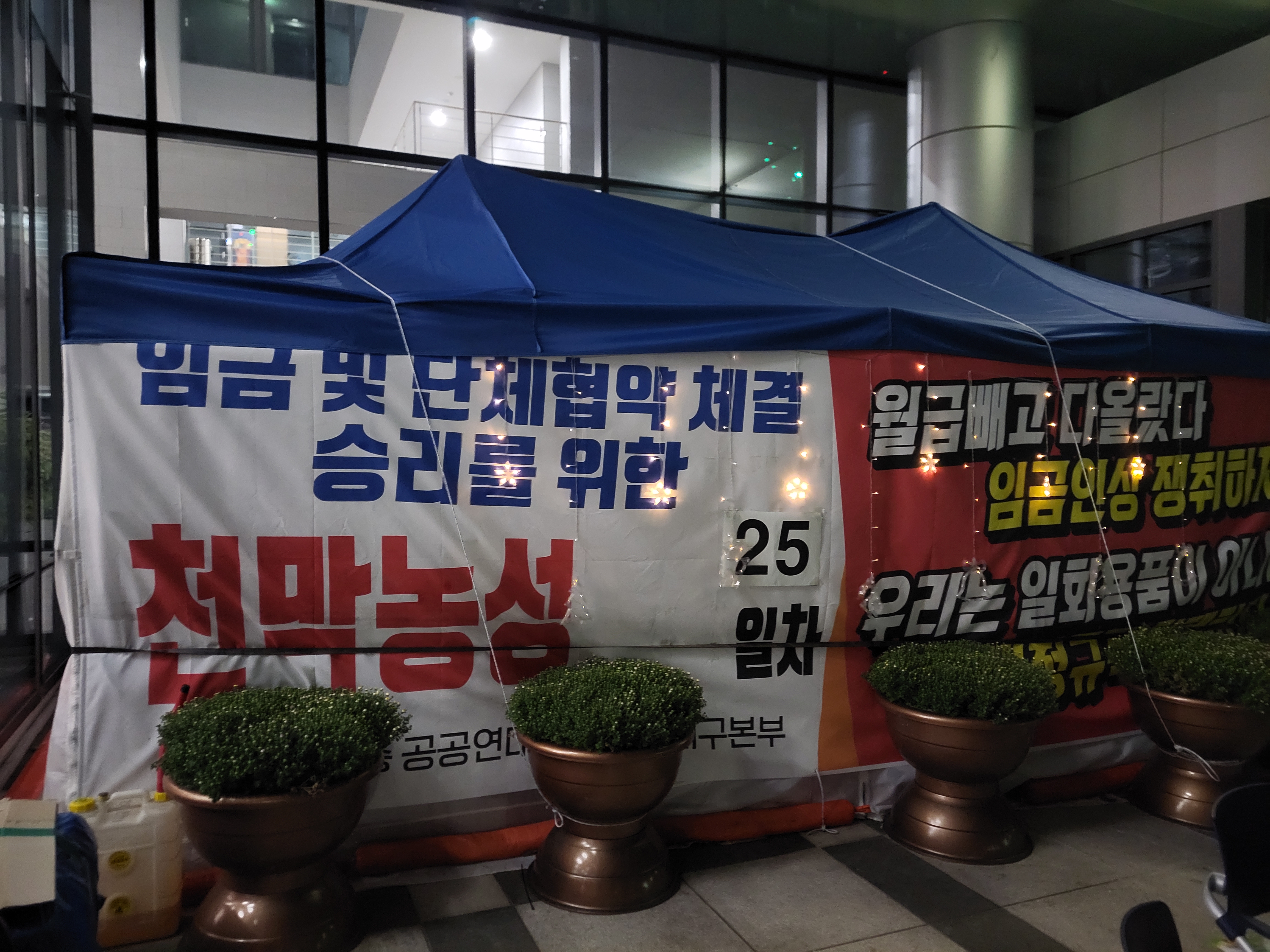 9월 22일 저녁 8시 천막농성 25일 차, 대학본부(E1) 앞에서 파업 당직을 서고 있는 노조 간부와 응원 방문한 노조 소속 노동자(이하 조합원)들을 만났다. 천막농성에서 막연히 상상되는 고된 투쟁의 이미지와 달리 천막은 따뜻한 분위기의 미니전구로 장식되어 있었고, 천막 앞 테이블은 음식으로 가득해 루프탑 카페에 온 듯했다. 실제로 조합원들은 매일 저녁 캠프파이어를 하는 느낌이라며 이런 즐거움이 파업을 지속할 수 있는 원동력임을 강조했다. 늦은 시간임에도 다른 교내 구성원이 방문해 조합원들에게 인사와 응원을 남기기도 했다. 무르익은 분위기 속에서 첫 번째 인터뷰이를 만났다.