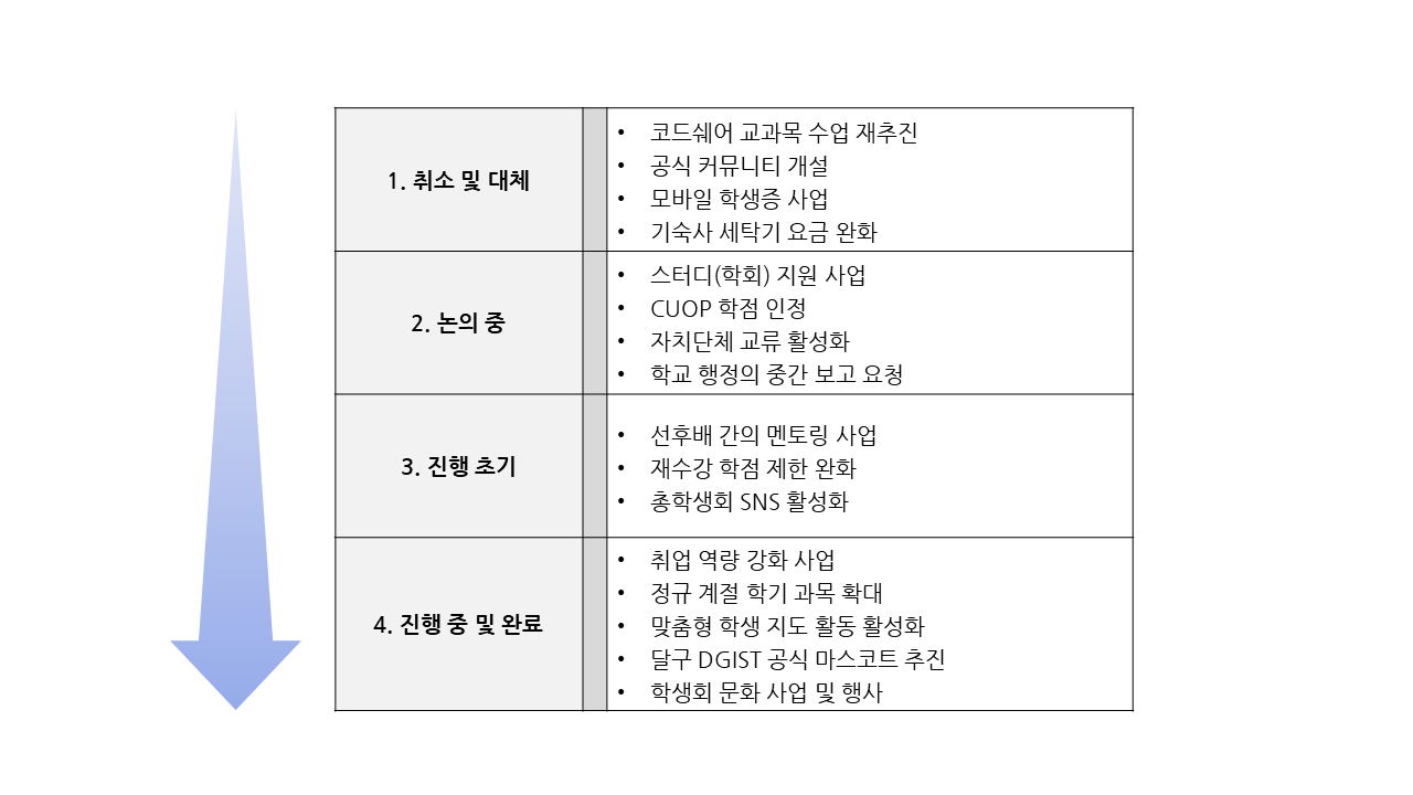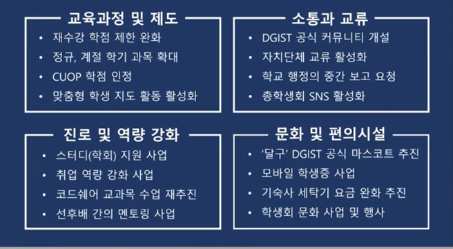현 DGIST 융복합대학 6대 총학생회장단 for’D(이하 for’D)가 3월 30일 당선된 후로 약 7개월이 지났다. for’D는 후보 등록 당시 4개의 대공약 ▲교육과정 및 제도 개편 ▲소통과 교류 ▲진로 및 역량 강화 사업 추진 ▲문화 및 편의시설을 내세웠고 각각의 공약에 4개의 소공약을 제시했다. 그러나 진행 상황에 비해 이 16개 소공약의 진행도를 잘 모르는 학생들이 많으며, 불만 섞인 목소리가 흘러나오기도 했다. 이에 DNA는 내일(26일) 열릴 간담회에 앞서 각 공약의 진행 상황을 집중 탐구했다.