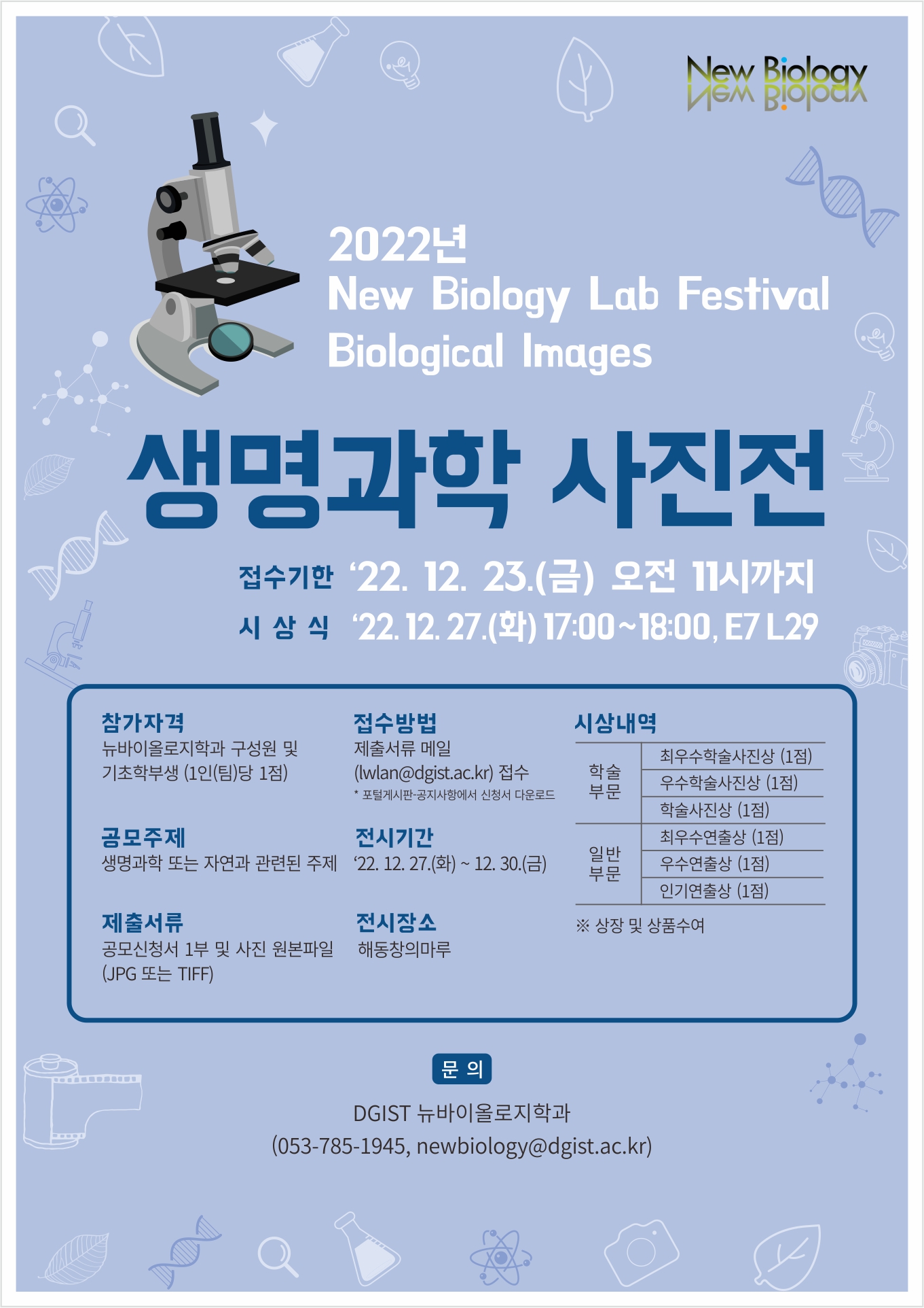 DGIST 뉴바이올로지학과에서 27일(화)부터 30일(금)까지 4일간 생명과학 사진전 「2022년 New Biology Lab Festival – Biological Images」을 개최한다. 참가자는 뉴바이올로지학과 구성원 및 기초학부생으로, 데이터 및 연구활동 관련 사진을 전시한다. 전시 장소는 E7 해동창의마루이며 DGIST 구성원 누구나 관람할 수 있다. 전시작 중 6점을 대상으로 27일(화) 17시, E7 L29에서 시상이 진행된다.