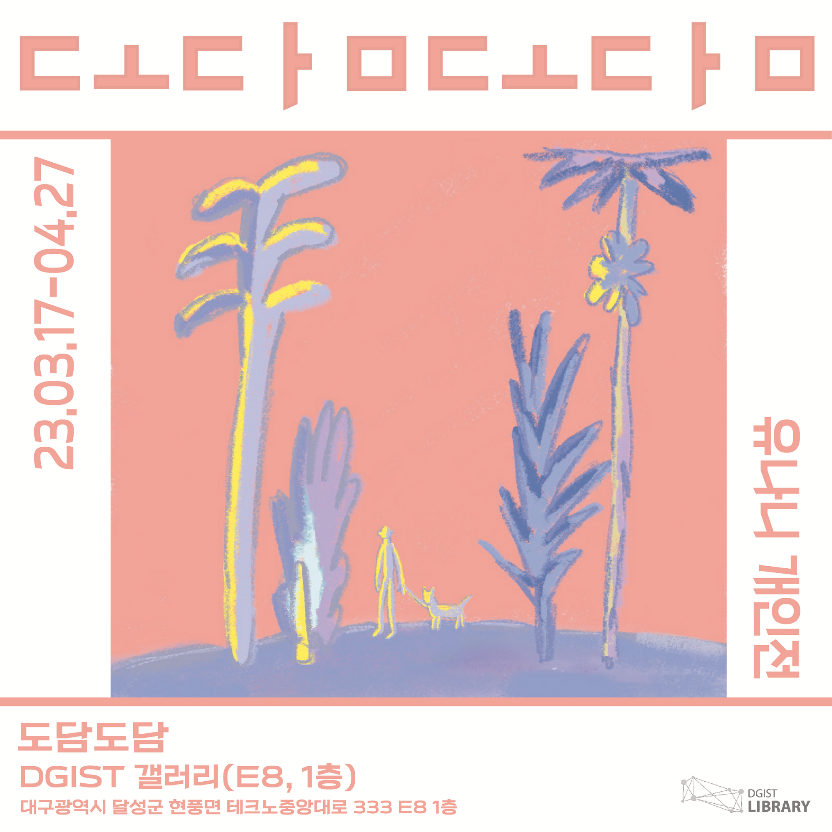 DGIST 학술문화팀이 학술정보관 1층 갤러리(E8 106호)에서 오는 4월 27일(목)까지 신진작가 ‘유나니’의 기획 전시회 ‘<도담도담> 展’을 진행한다. 본 전시회의 키워드는 ▲어린 아이의 순수한 마음 ▲동심 ▲성장 ▲일상 속 행복 ▲자유다. 구성원들에게 동기부여와 응원의 메시지를 전달하려는 유나니 작가의 목적이 담겨있다.