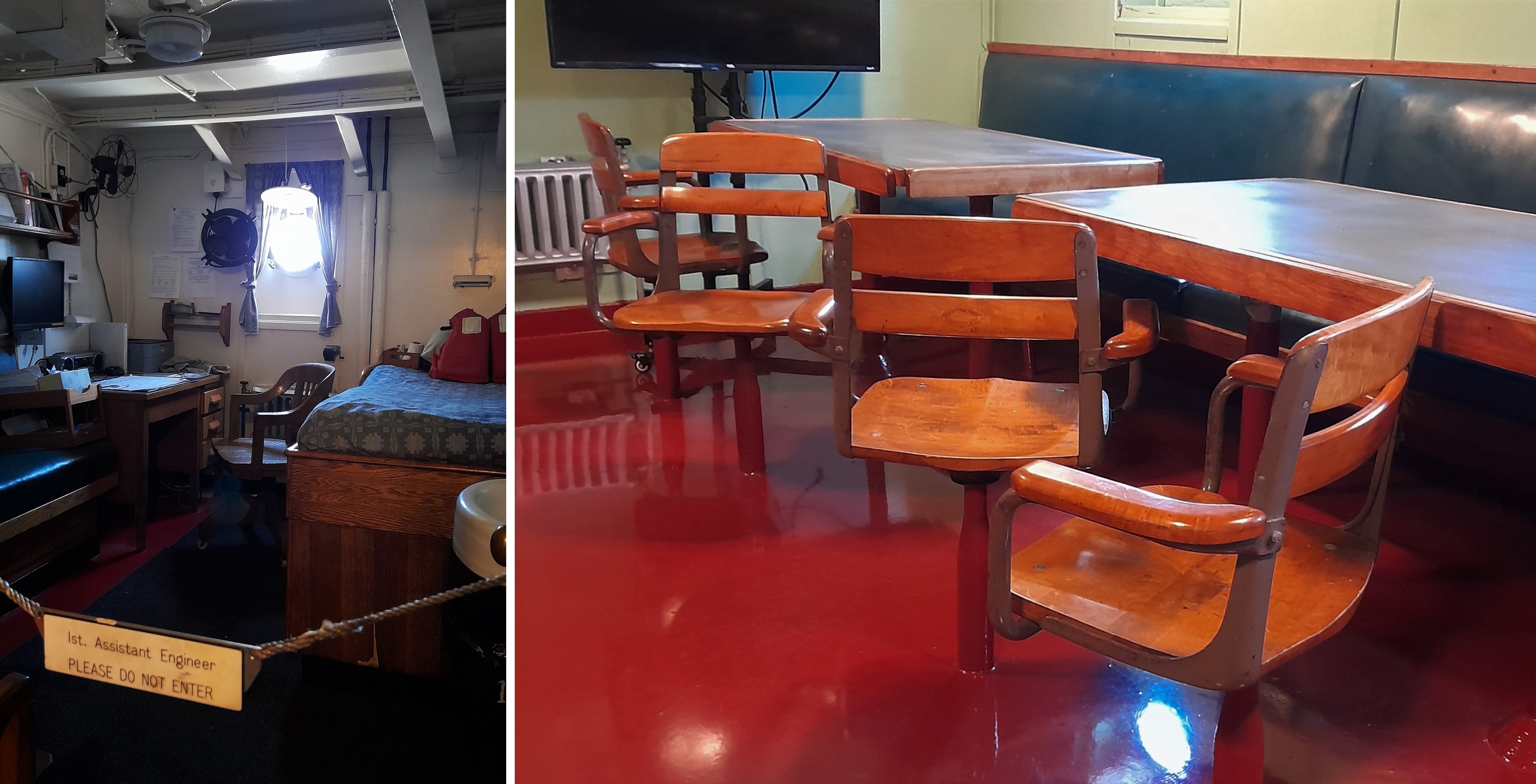 한편 USS Pampanito 내부에도 잠수함의 엔진룸과 조종실, 생활공간 등이 있는데, 잠수함의 크기를 최소화하기 위한 낮은 침대와 작은 문, 좁은 공간에 가능한 효율적으로 배치된 기계 장치 등을 확인할 수 있다. 붉은 조명이 켜져 있는 조종실의 화면에는 이 잠수함이 운행했던 기간과 경로가 표시되어 있다.