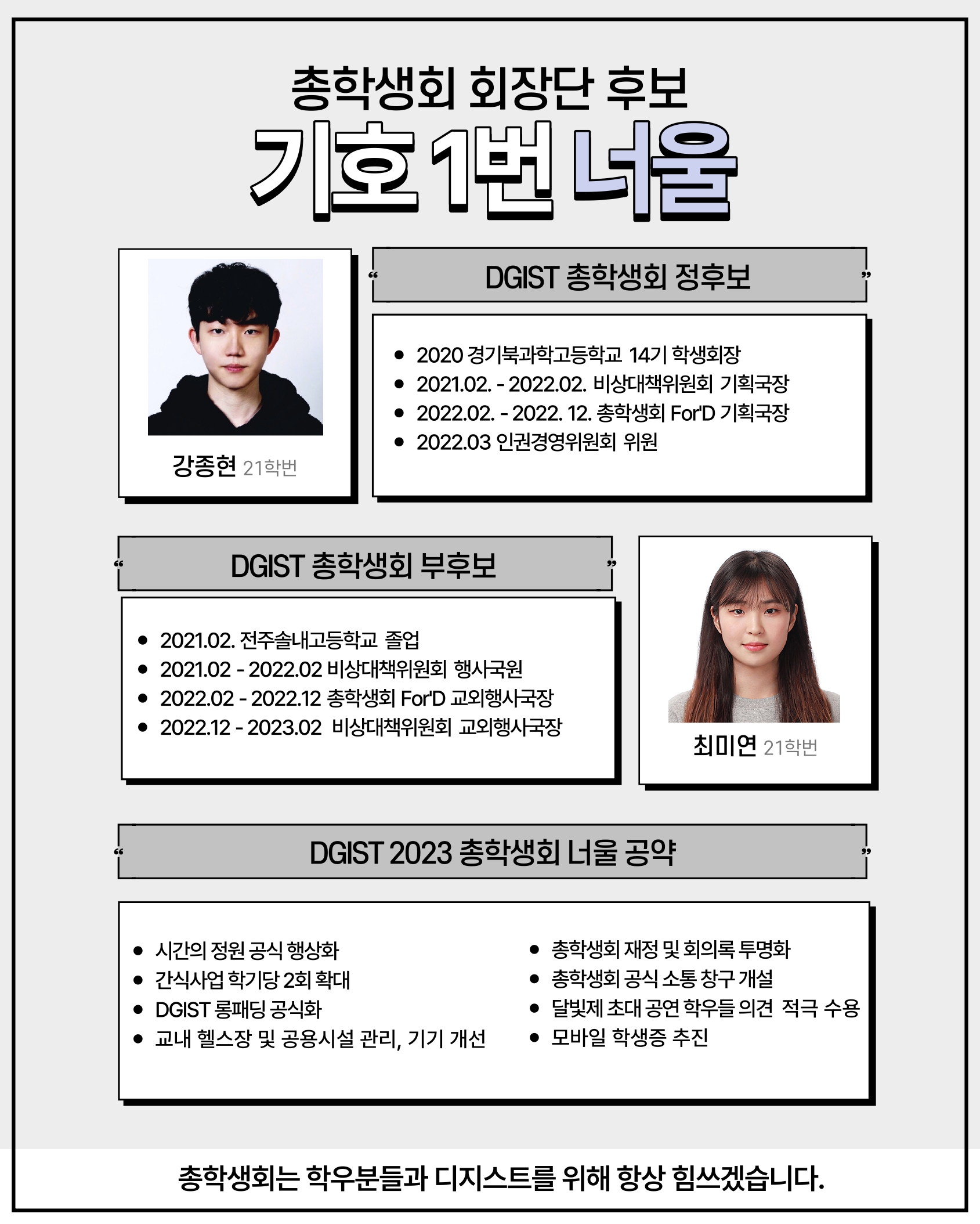 | [총학생회장단 후보자 연설회] 'DGIST를 위해 소통하겠다' 당찬 포부와 함께 등장한 for'D (1) | 2022.03.17 |
