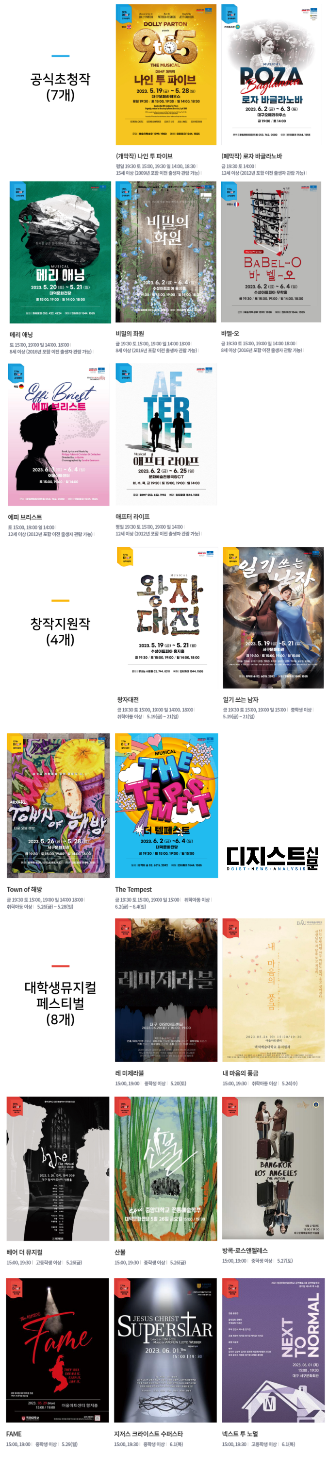 제17회 DIMF는 5월 19일부터 6월 5일까지 17일간 개최되며 ▲5월 19일 개막식 ▲20일 개막축하공연 ▲6월 5일 DIMF 어워즈 등 공식행사에 더불어 ▲뮤지컬 딤프린지 ▲만원의행복 ▲스타데이트 ▲열린뮤지컬특강 ▲백스테이지투어 ▲하이터치회 및 팬사인회 ▲뮤지컬 토크쇼 M.Talk를 비롯한 다양한 부대행사가 열린다.