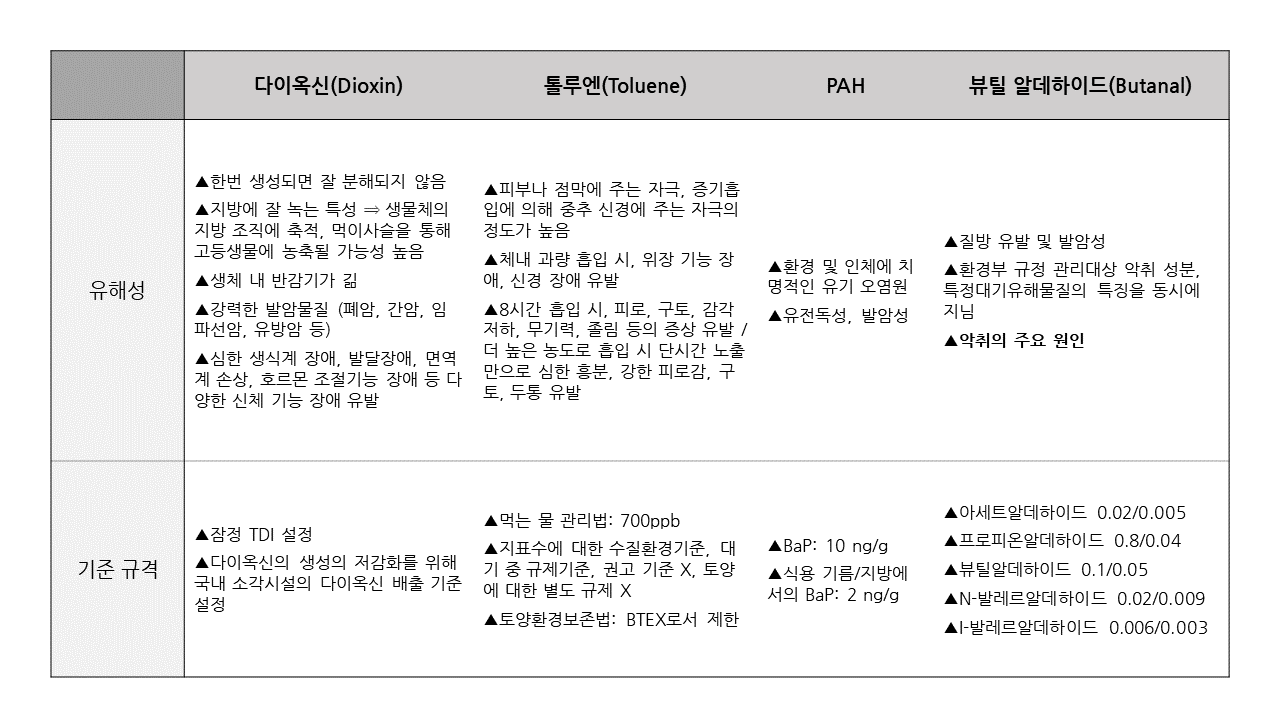 제지공장에서 발생할 수 있는 유해물질을 표로 정리하였다. 대표적인 유해물질로 다이옥신 톨루엔 ▲PAH ▲부틸 알데하이드가 있으며, 각 물질의 유해성과 규정 기준 현황은 아래 표와 같다.