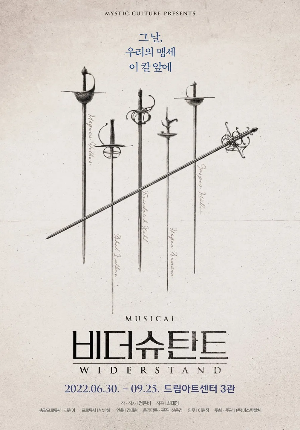 뮤지컬 <비더슈탄트>는 2022년 초연을 맞은 대한민국 창작 뮤지컬이다. 서정적인 가사와 연출, 다양한 상징으로 그려지는 작품의 주제는 비극에 가까운 이 이야기를 슬프지만 감동적인 방식으로 관객들에게 전달한다. 작품 전반에 걸쳐 복선과 상징이 숨어 있어 한 번 보았을 때보다 두 번, 세 번 보았을 때 의미가 더 깊게 다가오는 작품이기도 하다. 이에 더해 6명의 배우가 합을 맞추는 펜싱 장면은 국내 최초 펜싱 뮤지컬이라는 이 작품의 특징을 부족함 없이 드러낸다. 특히 <비더슈탄트>는 초연부터 3개월이 넘는 시간 동안 많은 사랑을 받으며 공연된 만큼, 앞으로의 발전이 더욱 기대되는 작품이다.