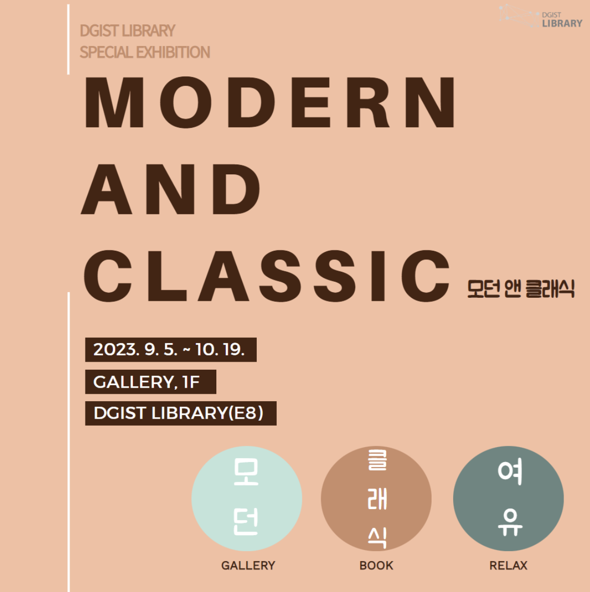 DGIST 학술문화팀이 특별전시 <모던 앤 클래식>展을 10월 19일(목)까지 DGIST 학술정보관(E8) 1층 갤러리에서 진행했다. 본 전시회에 달린 태그는 ▲모던 ▲클래식 ▲여유 ▲시작이다. 일상의 풍경과 소재를 새로운 상상과 색다른 조화로 표현한 작품을 관람할 수 있었다.