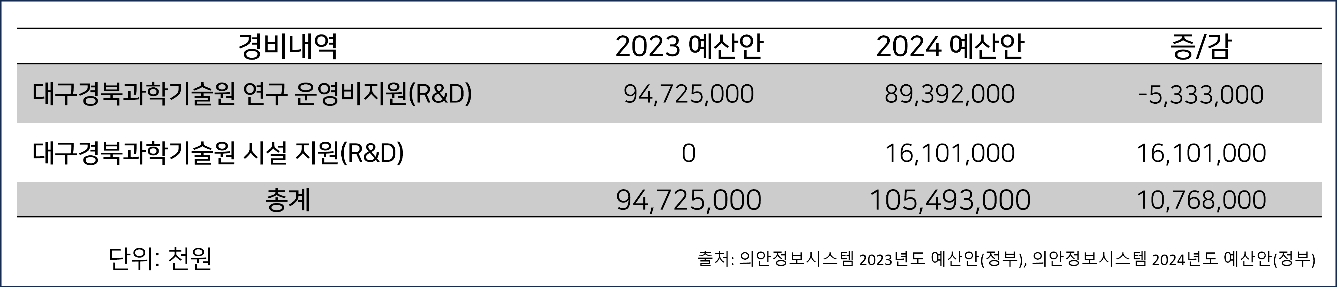 그럼 직할 출연연구기관인 DGIST는 어떤 영향을 받았을까? 정부가 국회에 제출한 2023년도 예산안과 2024년도 예산안에 따르면, 직할 출연연구기관 지원 예산에 포함된 DGIST 관련 경비내역에는 올해와 내년 예산안에 공통적으로 대구경북과학기술원 연구 운영비지원(R&D)이 포함되었으며 내년도 예산안에 대구경북과학기술원 시설 지원(R&D)이 추가되었다. 모든 내역에 대해 예산 총합은 올해보다 107억 6,800만 원 증가했지만, 연구 운영비 지원은 올해에 비해 53억 3,300만 원 감소했다.