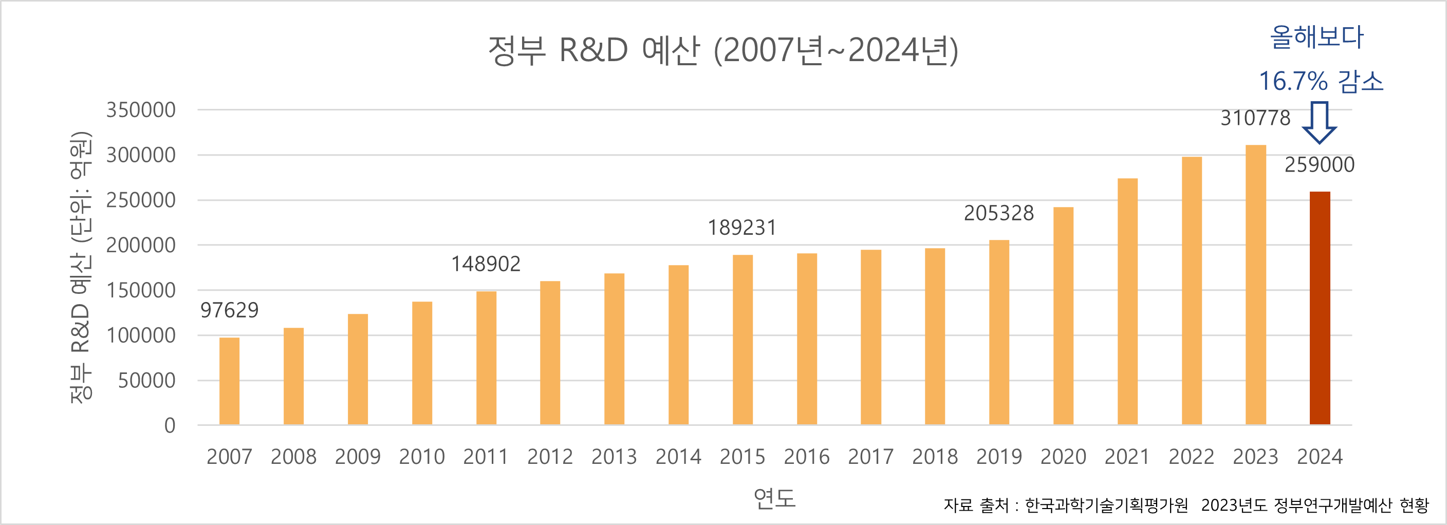 매년 증가해 왔던 R&D 예산이 33년만에 삭감되었다. 정부가 편성한 내년도 R&D 예산은 25조 9,000억 원으로, 올해 예산인 31조 778억 원보다 16.7%가 줄어든 금액이다. 과학기술정보통신부(이하 과기부)는 비효율적이고 관행화된 사업에 대한 구조조정을 통한 예산 효율화 과정에서 이루어진 감축이라고 설명했다.