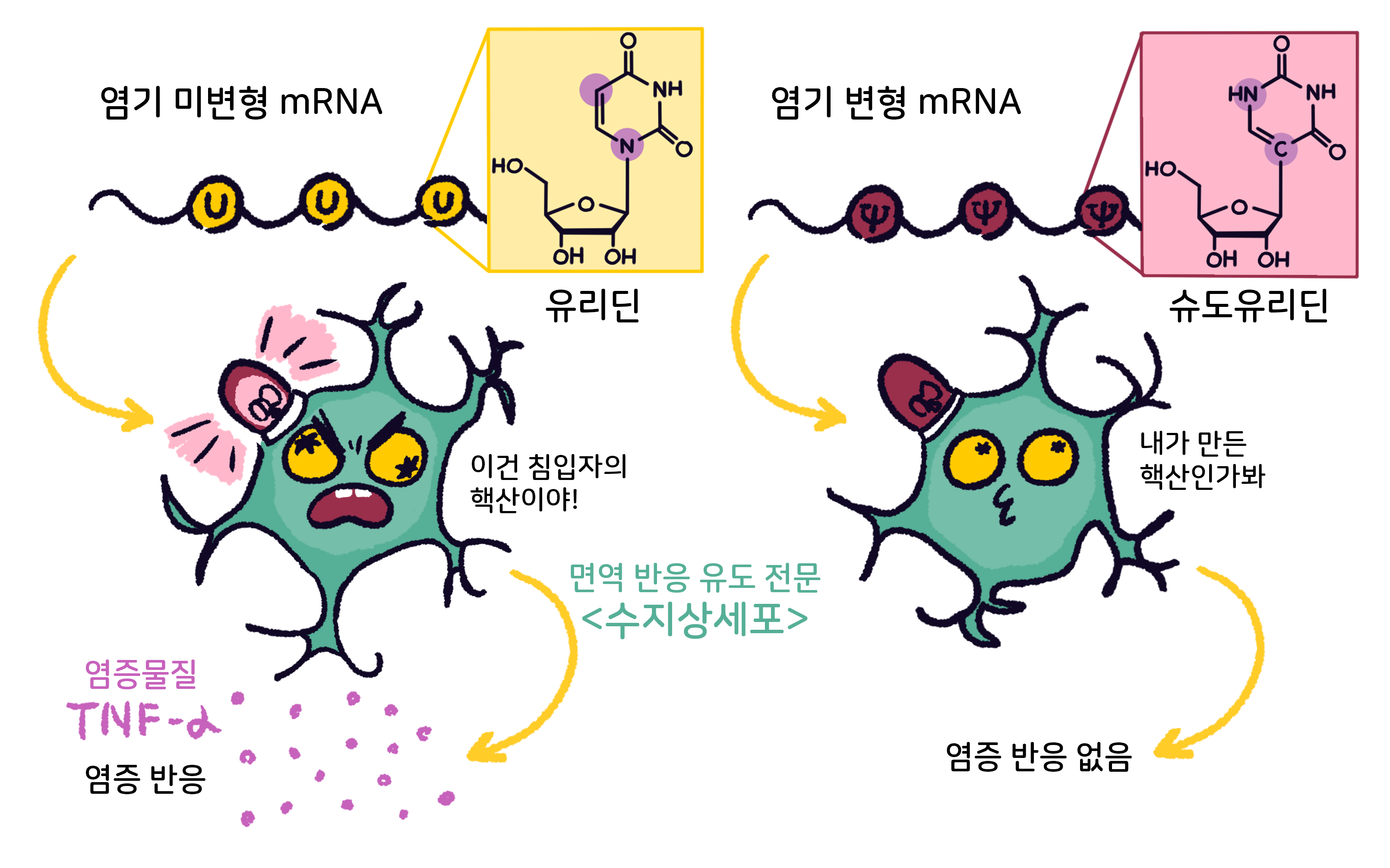 염기 변형 여부에 따른 면역 세포의 반응 <그림 = 김신지 기자>