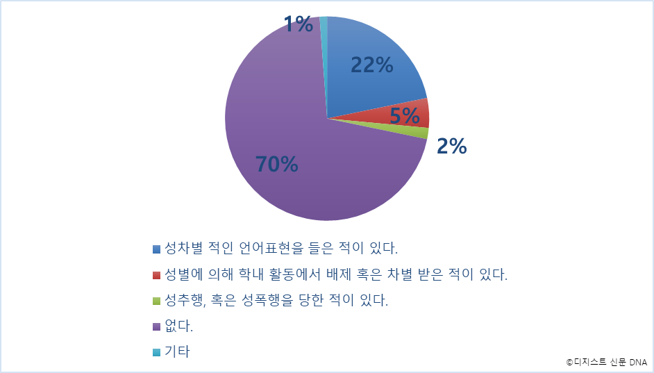 또한 응답자 165명 중 29%가 DGIST 내에서 성에 따른 차별 혹은 피해 경험이 있다고 답했다. ‘성차별적인 언어 표현을 들은 경험이 있다.’가 22%로 제일 많았으며, ‘성별에 의해 학내 활동에서 배제된 경험이 있다.’가 4.8%로 뒤를 이었다. 48명의 응답자가 성 관련 인식에 관해 의견을 남겼으며, 그중 6명이 양성평등 교육의 필요성 및 범위 확대를 강조했다.