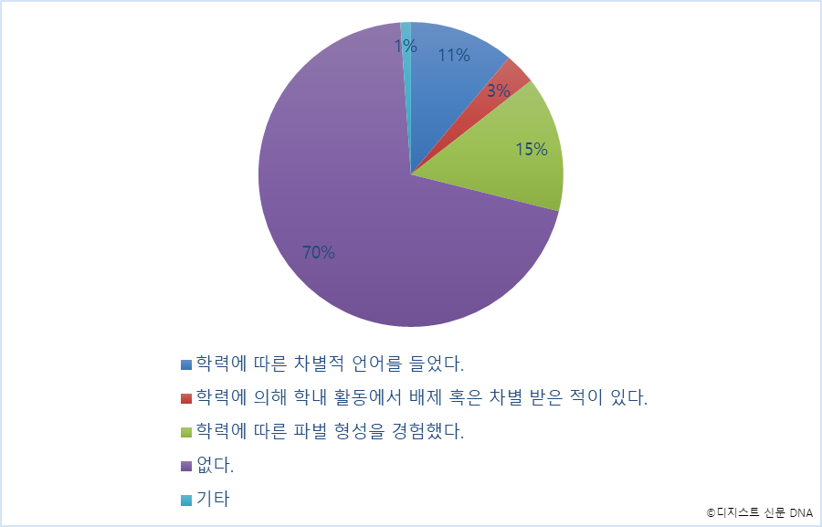 또한 31.5%의 응답자가 DGIST 내에서 학력에 따른 차별 혹은 피해 경험이 있다고 답했다. ‘학력에 따른 파벌 형성을 경험했다.’ 와 ‘학력에 따른 차별적 언어를 들었다.’가 각각 14%와 11%를 차지했다.