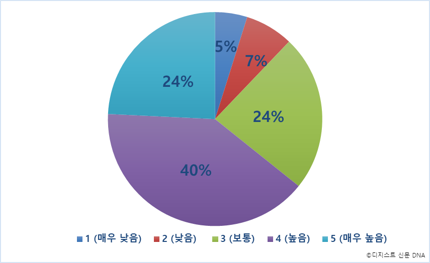 DGIST 구성원의 전반적인 인권 의식 수준을 묻는 질문에, 5점(매우 높음)부터 1점(매우 낮음)까지 점수를 매겼다. 5점 만점으로 평가한 응답은 24%로, 4점을 매긴 40%의 응답자에 이어 두 번째로 많았다. 보통인 3점도 5점과 마찬가지로 24%였으며, 2점과 1점으로 평가한 응답은 각각 7%와 5%로 뒤를 이었다.