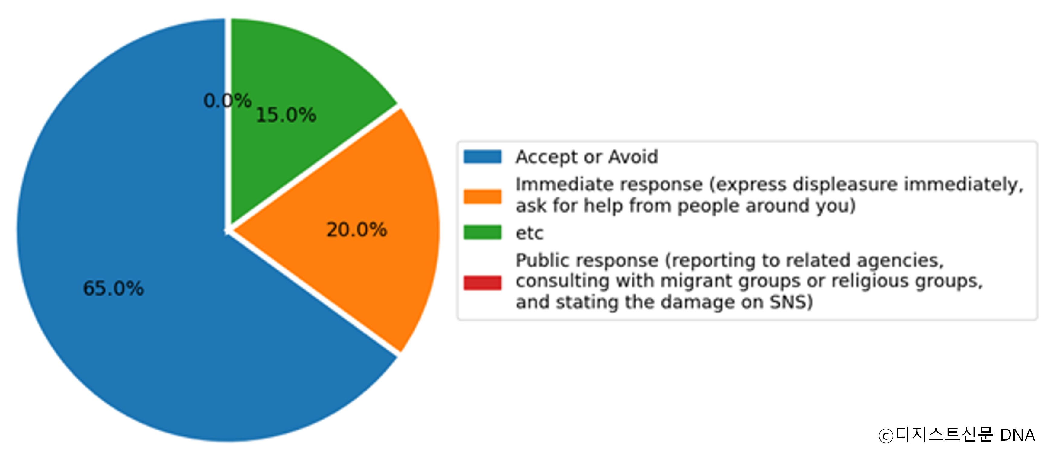 이런 상황 속 인종차별을 당한 이들 중 65%는 적극적으로 대응하지 않고 받아들이거나 무시했다고 밝혔다.