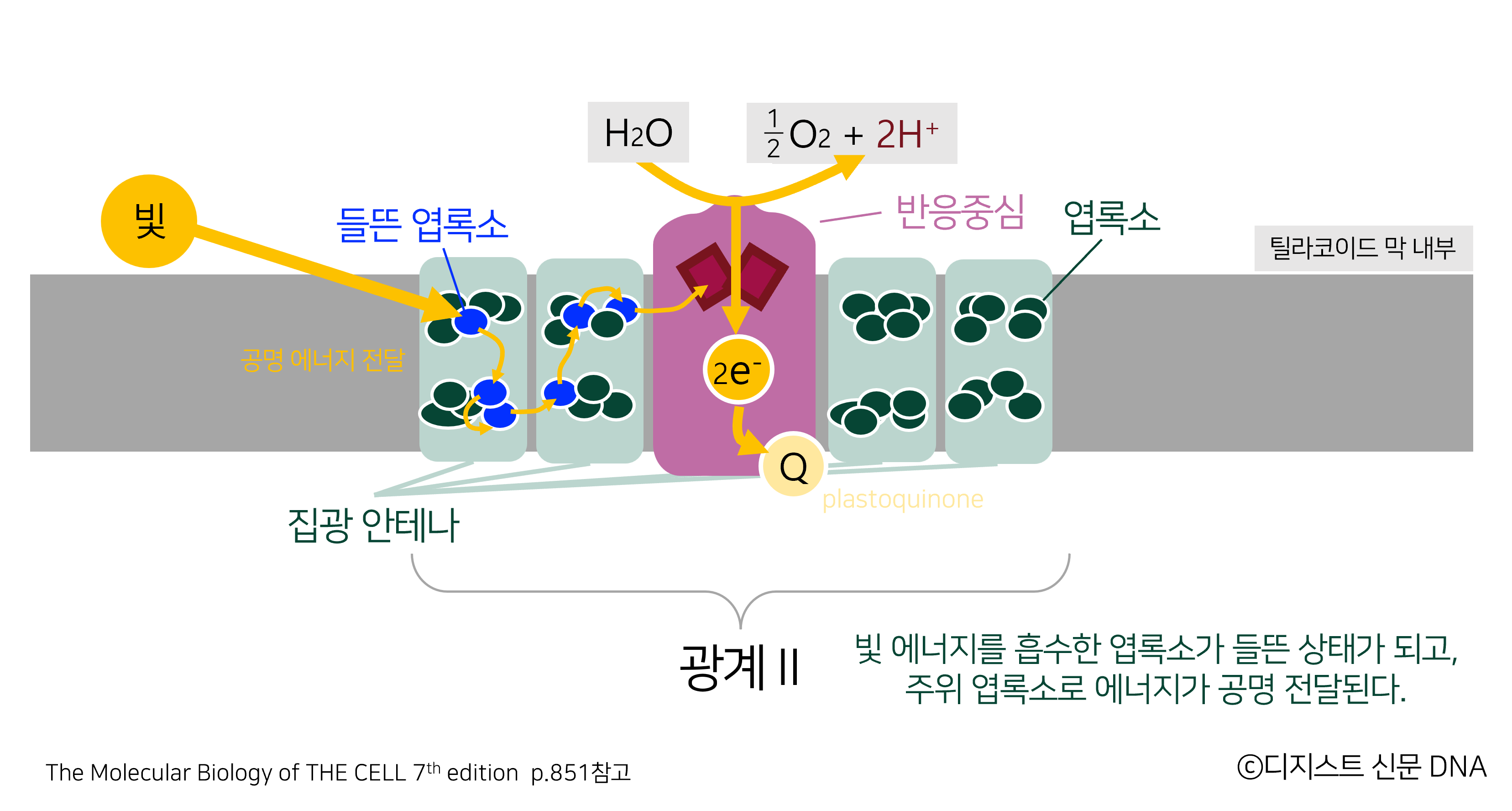 그러나 슈뢰딩거의 말이 옳음이 증명됐다. 생명 속 양자 현상이 진짜로 존재한 것이다. 2007년에 UC Berkeley의 그레고리 엥겔(Gregory Engel) 연구팀은 “광합성의 양자 결맞음을 통한 파동적 에너지 전달의 증거”라는 제목의 논문을 발표했다. 연구 결과를 이해하기 위해서는 생물학적 배경지식이 조금 필요하다. 광합성 과정은 크게 광의존반응과 광비의존반응으로 나뉠 수 있다. 연구팀은 광의존반응에서 빛 에너지 흡수가 일어나는 장소인 광계Ⅱ에 주목했다. 광계Ⅱ는 빛 에너지를 받아서 물로부터 광합성에 필요한 전자를 분리한다. 여러 개의 엽록소를 함유한 집광 안테나가 물 분자의 전자 분리가 일어나는 반응 중심 곁에 있고, 흡수한 빛 에너지를 반응 중심으로 전달해 주어 넓은 면적에 쐰 빛을 화학 반응에 이용할 수 있다. 엽록소가 빛을 받으면 엽록소 속 마그네슘의 최외각 전자가 들뜬 상태가 된다. 그리고 공명현상에 의해 들뜬 상태 엽록소에서 주위의 바닥 상태 엽록소로 에너지 전달이 일어난다. 에너지는 징검다리를 건너듯 집광 안테나 속 엽록소를 거쳐 반응중심으로 이동한다.