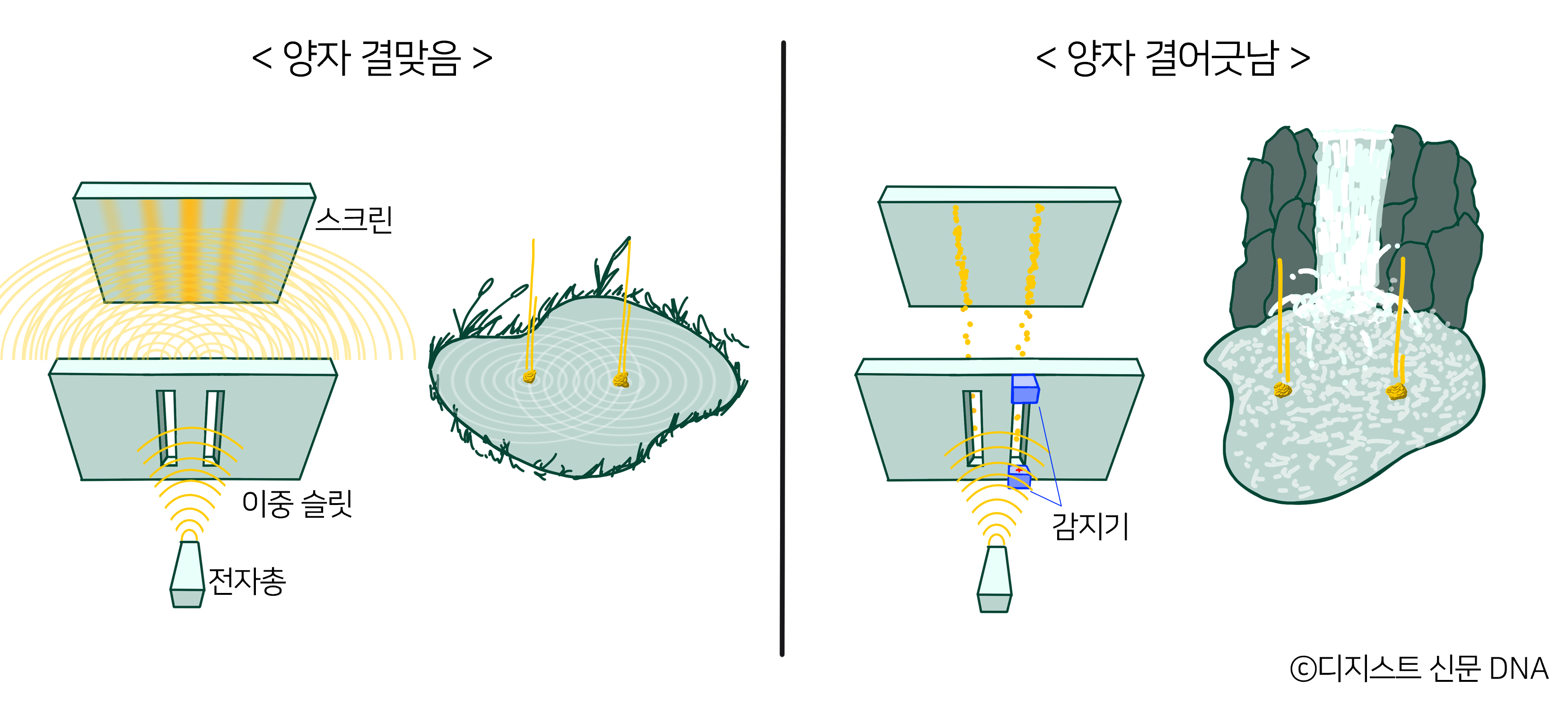 거시세계에서 파동성을 관측하기 힘든 이유를 이중 슬릿 실험에서 확인할 수 있다. 전자를 이중 슬릿을 향해 쏘면 뒤쪽 스크린에 간섭 무늬가 나타난다. 양쪽 슬릿을 통과하는 파동 사이에 간섭이 있어서 전자가 간섭무늬의 위치로 스크린에 도착하였다고 해석할 수 있다. 그러나 전자가 둘 중 어느 슬릿을 통과하는지 감지기로 관찰하면, 스크린에 간섭무늬가 아닌 두 개의 띠가 나타난다. 거시세계처럼 전자가 입자성을 가지게 된 것이다. 이중 슬릿 실험에서처럼 관찰이 파동성을 입자성으로 붕괴시키는 현상을 설명하는 것은 양자역학의 중요한 과제이다.