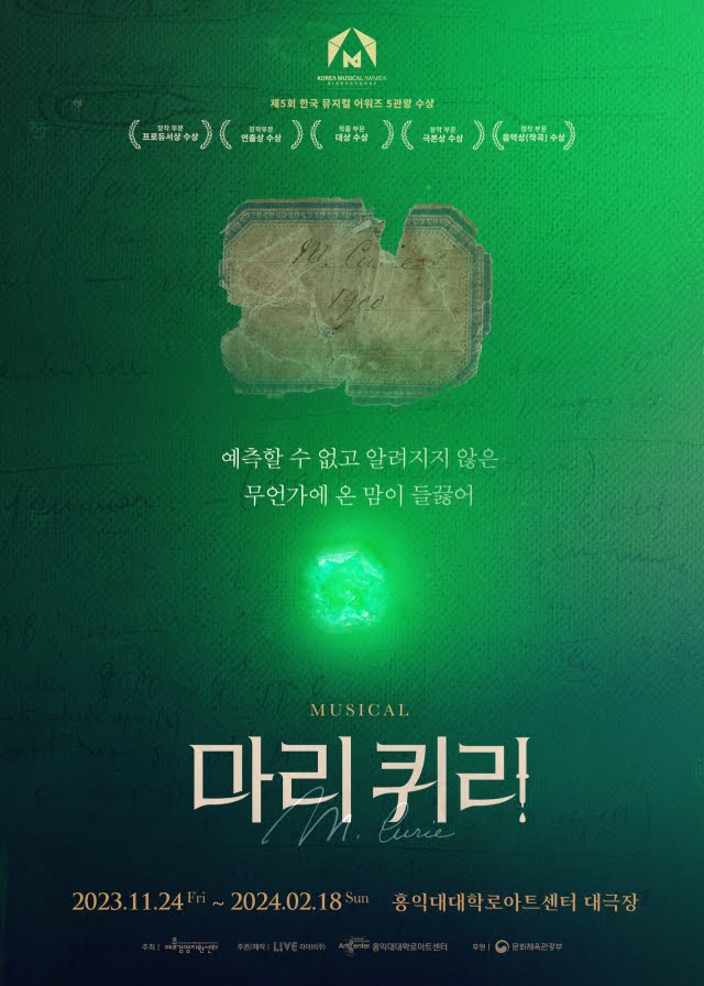 2018년 제작된 대한민국의 창작 뮤지컬 <마리 퀴리>는 2022년 마리 퀴리의 고향 폴란드에서 개최된 제22회 바르샤바 뮤직 가든스 페스티벌에서 최고상인 황금물뿌리개상을 수상했다. 특히 실제 마리 퀴리의 후손 한나 카레제프스카가 직접 공연 영상을 관람한 후 “아름답고, 놀랍고, 말로 표현할 수 없는 공연”이라는 평가를 남겼다. 뛰어난 작품성을 인정받아 영국, 일본, 중국으로 수출되는 등 한국 뮤지컬의 수준을 증명하는 또 하나의 수작이 되었다.