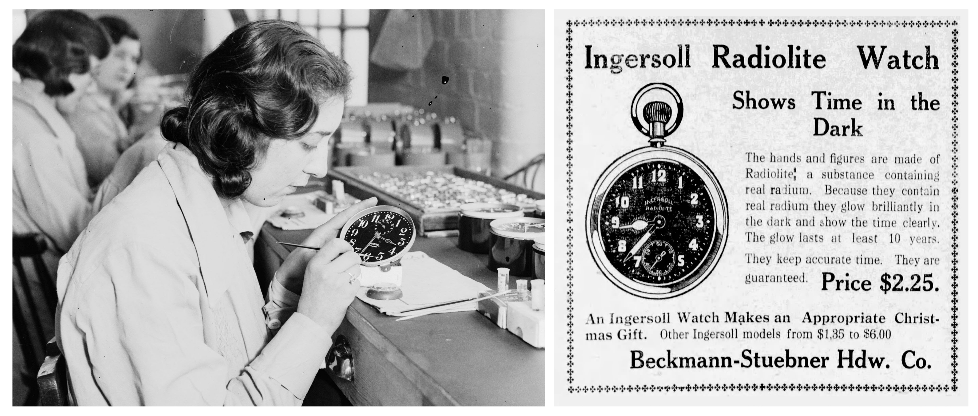 라듐의 유해성이 수면 위로 드러난 것은 1920년대 발생한 라듐 시계 공장 인부들의 사망 사건, 통칭 ‘라듐 걸즈’ 사건이었다. 당시 시계판에 라듐 페인트를 발라 만든 야광 시계가 인기를 얻으면서 공장은 10대 소녀들을 직공으로 대거 기용해 시계를 만들었다. 공장에서는 페인트를 칠하는 붓끝이 닳으면 핥아서 뾰족하게 만들어 사용하라고 지시했고, 자연히 직공들은 페인트에 함유된 라듐을 지속적으로 섭취했다. 그 결과 수많은 직공이 암에 걸리고 턱과 치아가 괴사하는 등 심각한 후유증을 앓다가 사망했다. 그러나 공장은 죽음을 은폐하기 위해 의사를 매수하여 사인을 조작했다. 죽음을 공론화하지 못하도록 성병인 매독을 사인으로 지목하는 경우도 많았다. 뮤지컬 속 「죽은 직공들을 위한 볼레로」는 바로 이 사건을 각색한 것이다. 라듐의 영향으로 목숨을 잃은 직공들이 억울하게 매도당한 죽음에 울분을 토한다. 그들의 몸에 잔뜩 묻은 라듐의 빛이 섬뜩하게 다가온다.
