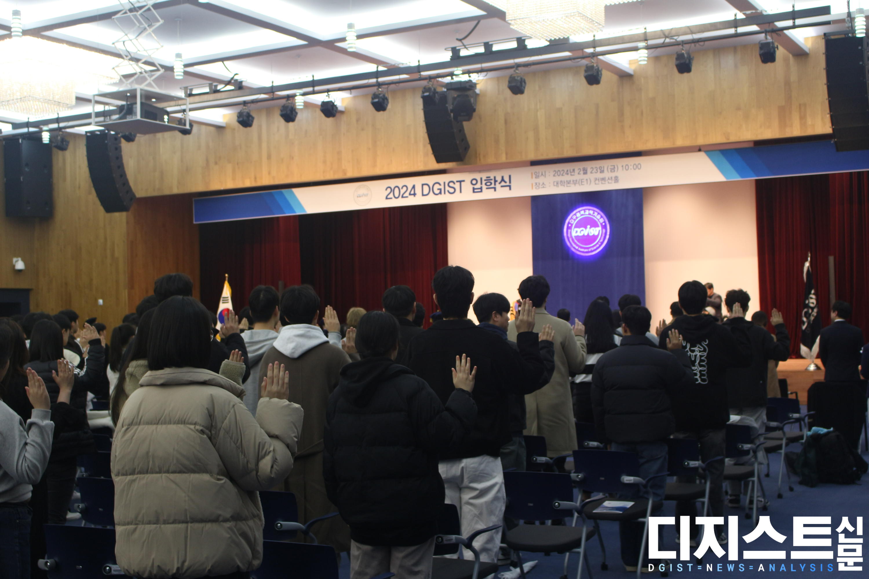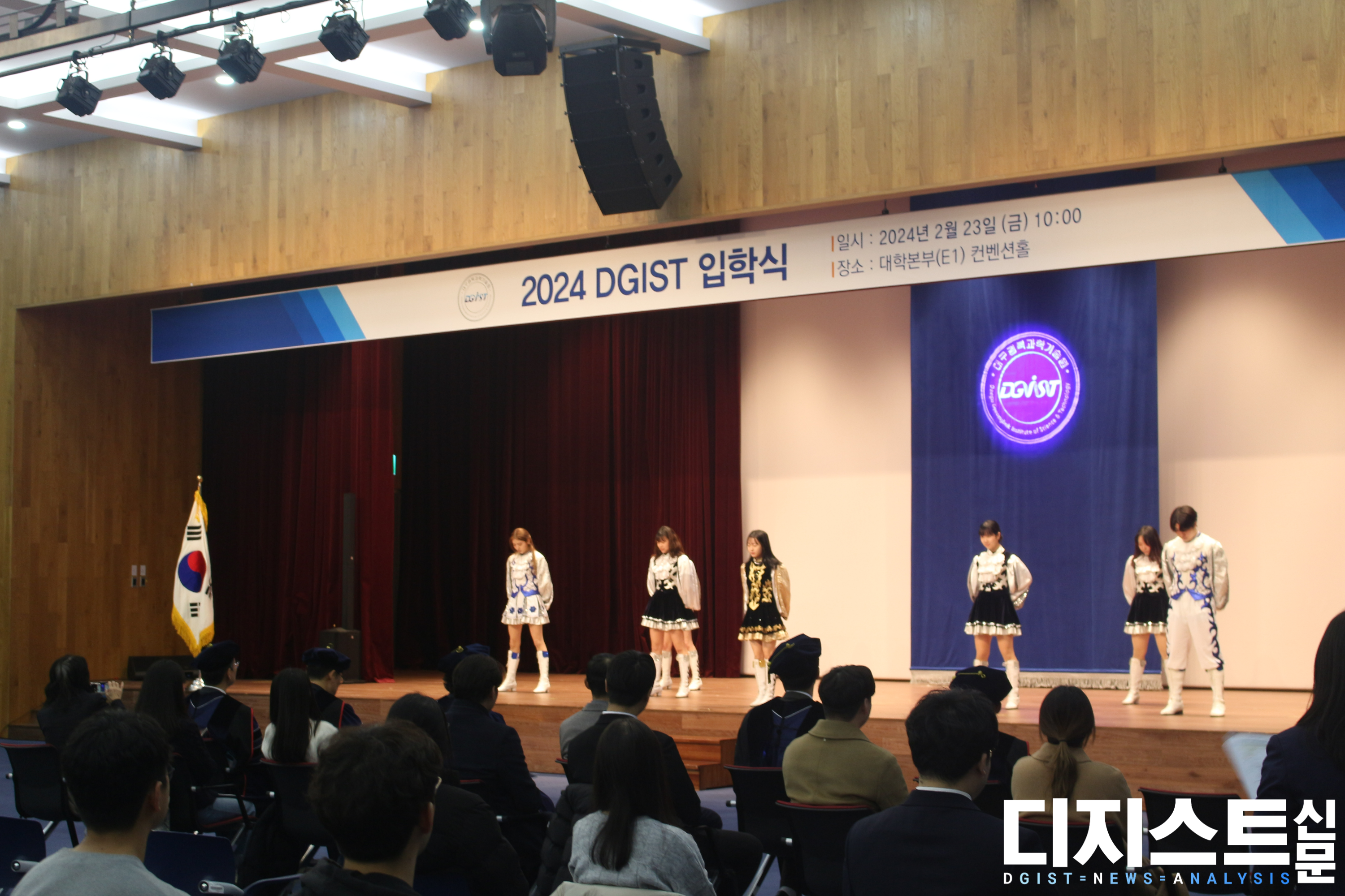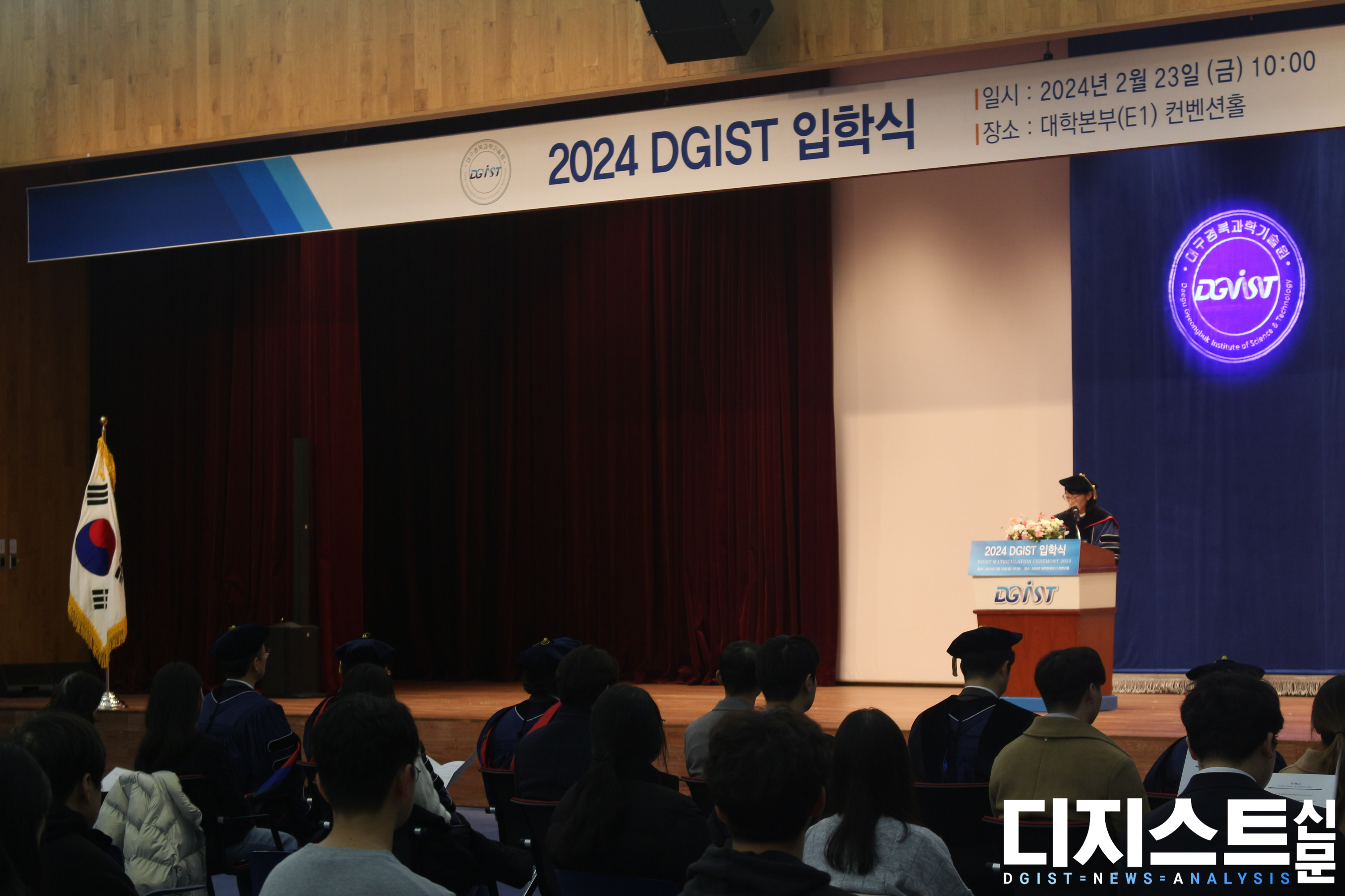 지난 23일, 대학본부(E1) 컨벤션홀에서 2024학년도 DGIST 입학식이 진행됐다. 이날 DGIST는 ▲학사과정 201명 ▲석사과정 161명 ▲박사과정 26명 ▲통합과정 29명 총 417명의 신입생을 맞이했다. 행사는 ▲학사행렬 ▲학사보고 ▲입학허가선언 ▲입학선서 ▲장학증서 수여 ▲환영사 ▲교수학생선서 순으로 진행되었으며, DGIST 응원단 D.ONE이 축하공연을 선보였다.