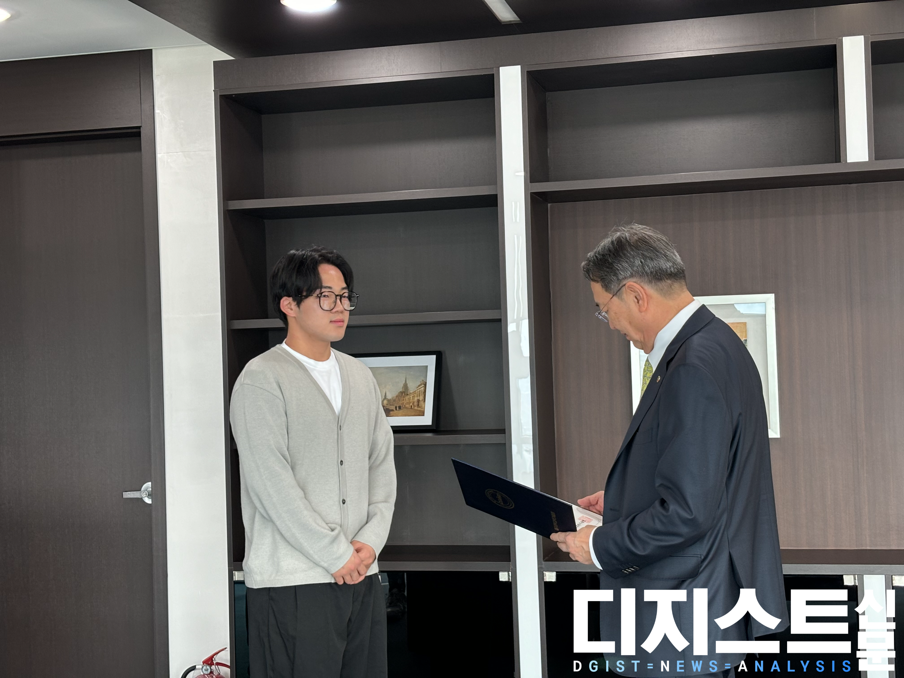DGIST 제5대 총장 이건우(이하 이건우 총장)를 방문한 제9대 총학생회 We'D가 당선증을 수여받았으며, 이를 기념하여 이건우 총장이 축하의 인사를 전했다.