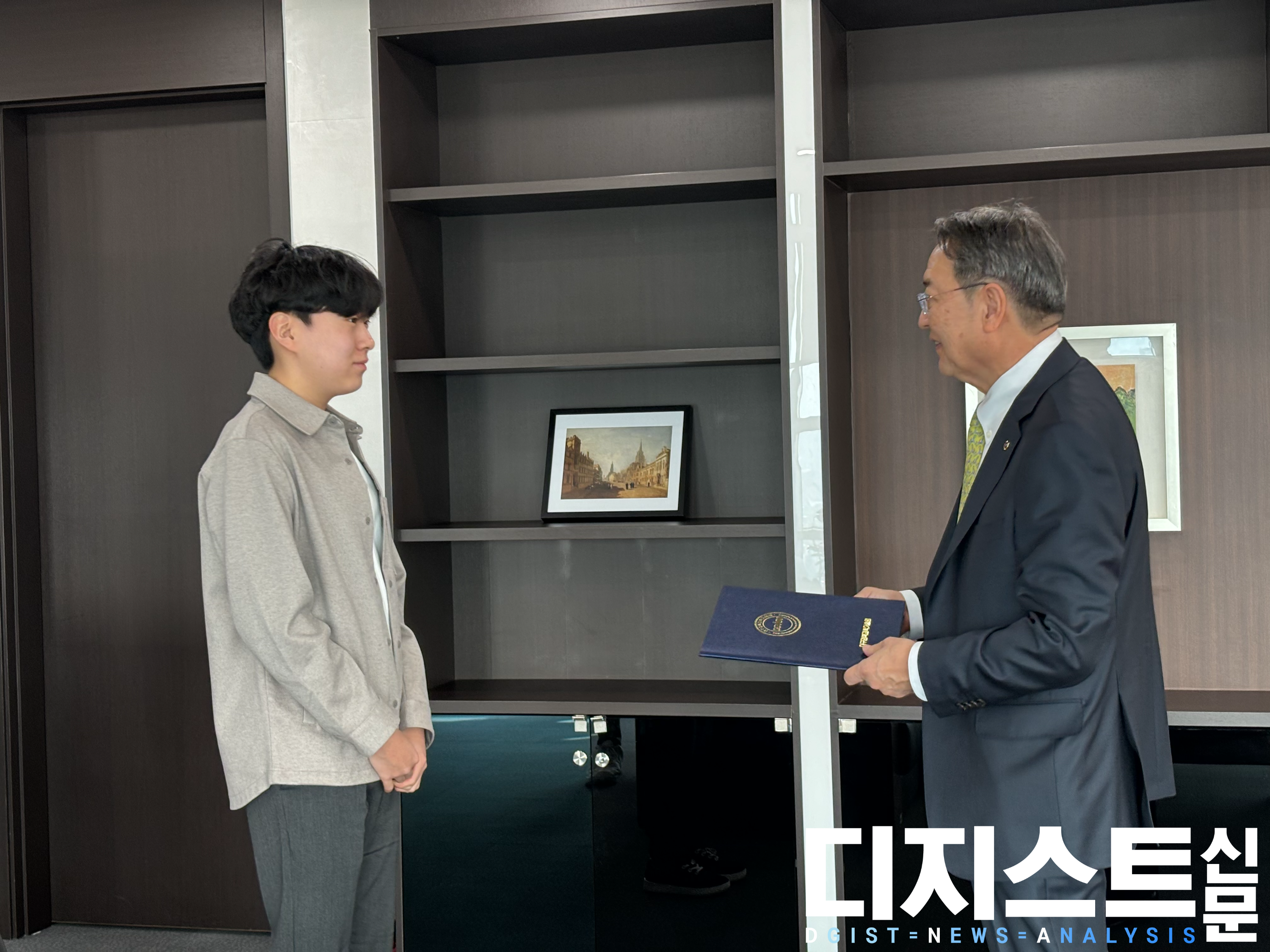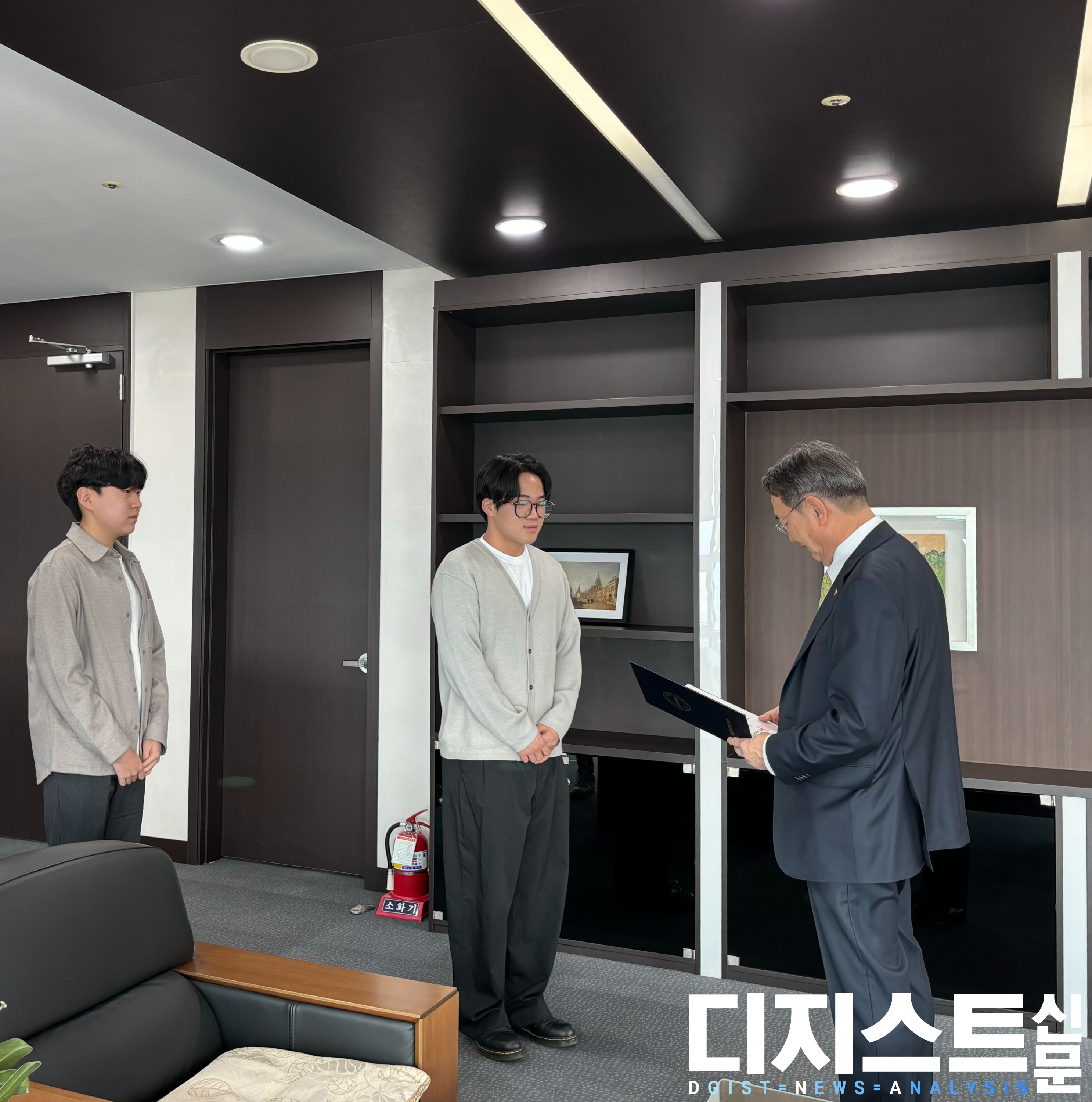 DGIST 제5대 총장 이건우(이하 이건우 총장)를 방문한 제9대 총학생회 We'D가 당선증을 수여받았으며, 이를 기념하여 이건우 총장이 축하의 인사를 전했다.